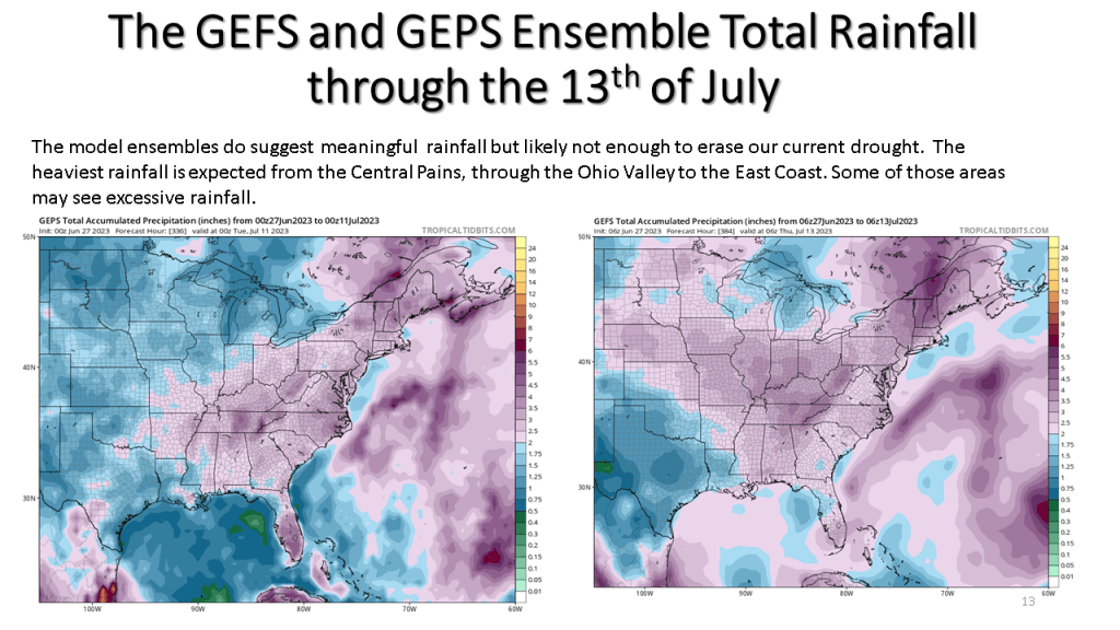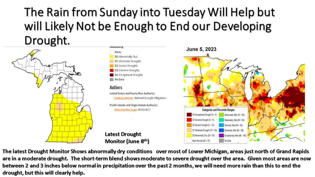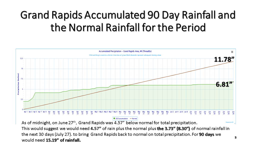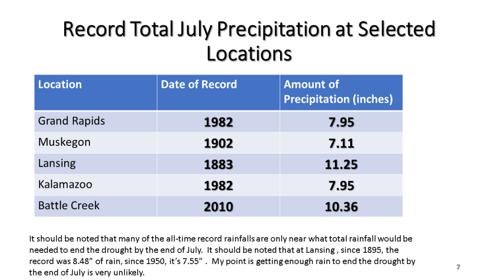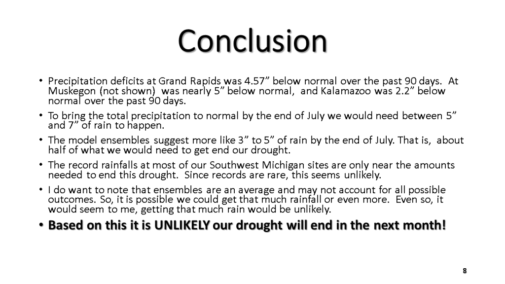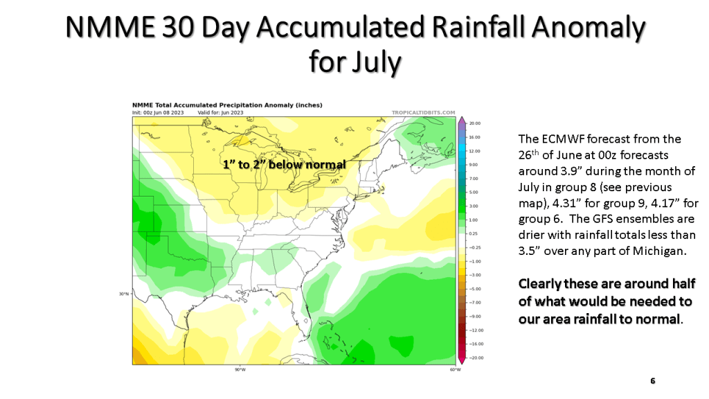 To end our current drought over southern Michigan we would need around 6 inches of rain by the end of July. This is near record totals for July at most of our climate sites. It would seem unlikely given our current weather pattern we would get that much widespread rainfall. So while we do expect more rain in the next month than the previous month, the expected rainfall will likely fall short of ending this drought.