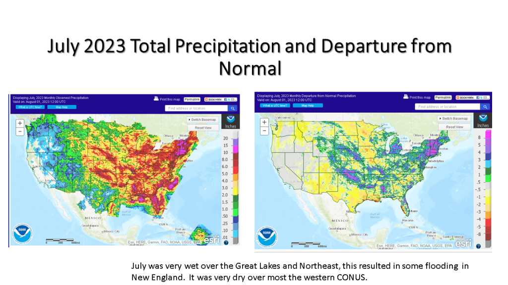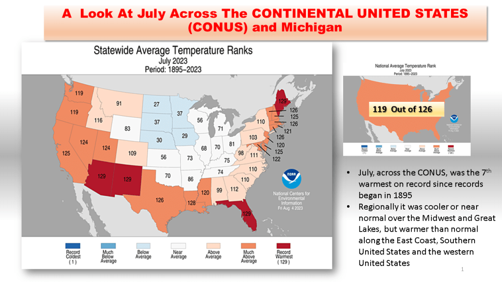 As promised I have posted the national images of July 2023. The short story is it was the 7th warmest and 45th wettest for the CONUS. In Michigan it was the 58th warmest and 5th wettest on record.