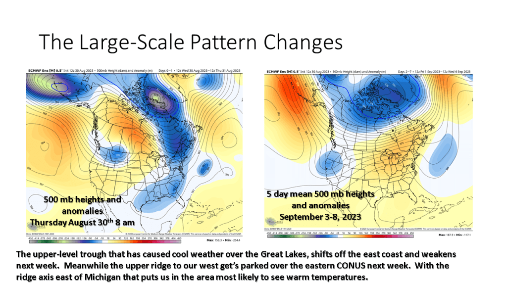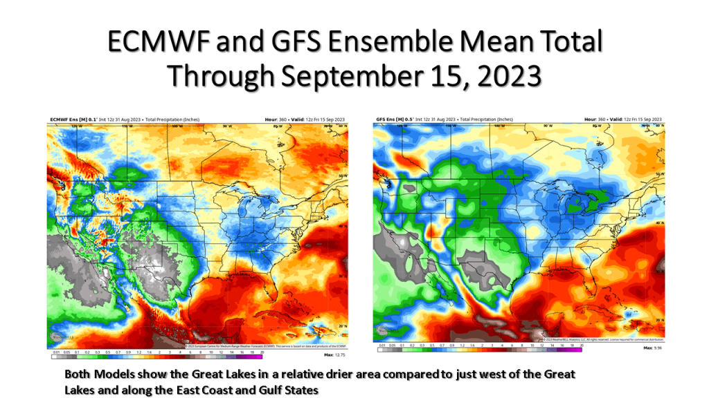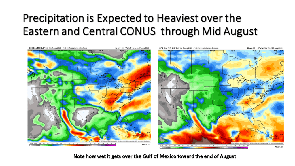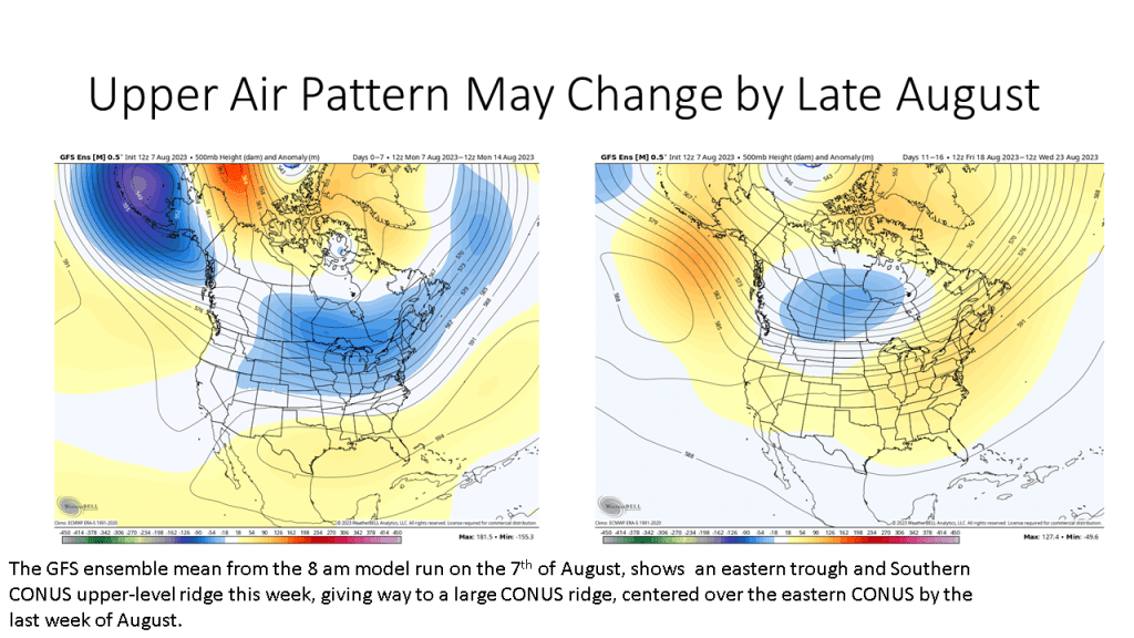 We continue to see an overall eastern North American trough and western upper level ridge prevailing through the 3rd week of August. It does however look like a case of discontinuous retrogression by the later part of August as the models show a large upper ridge developing late in the month over most of the Continental United States (CONUS).