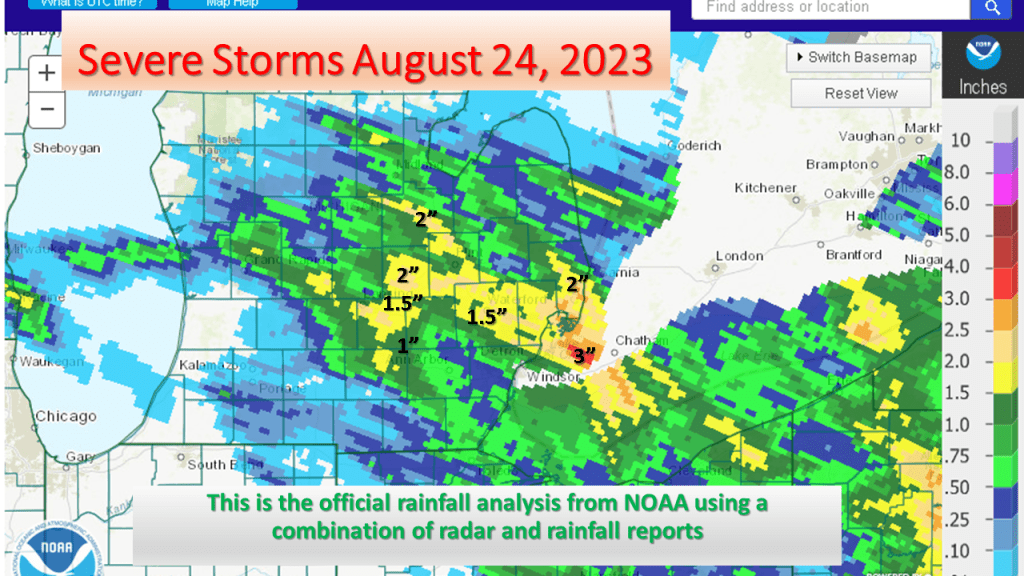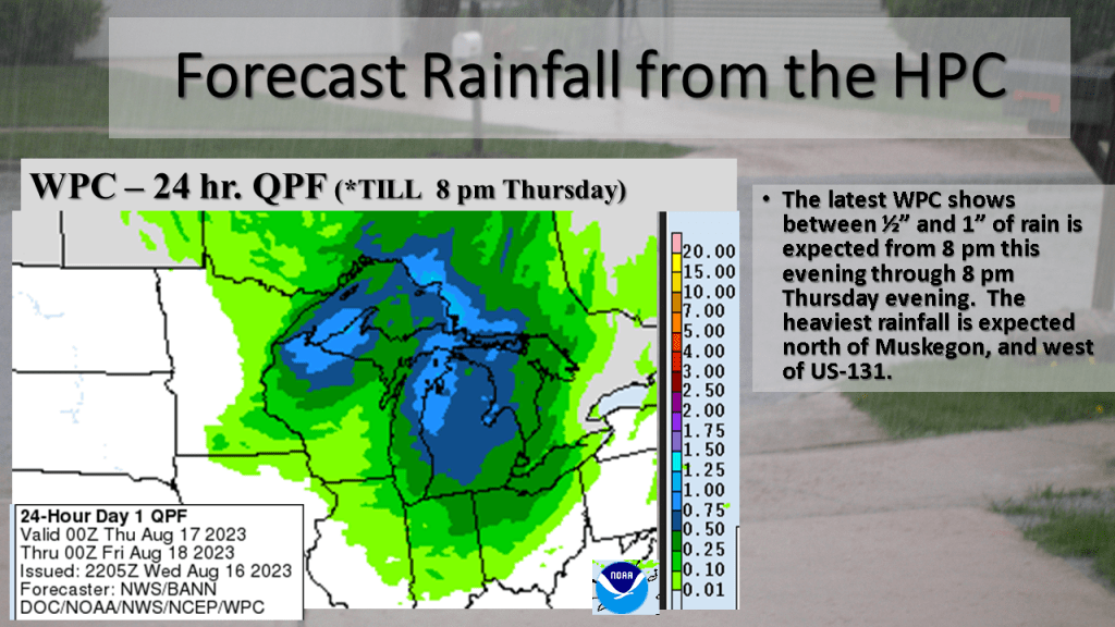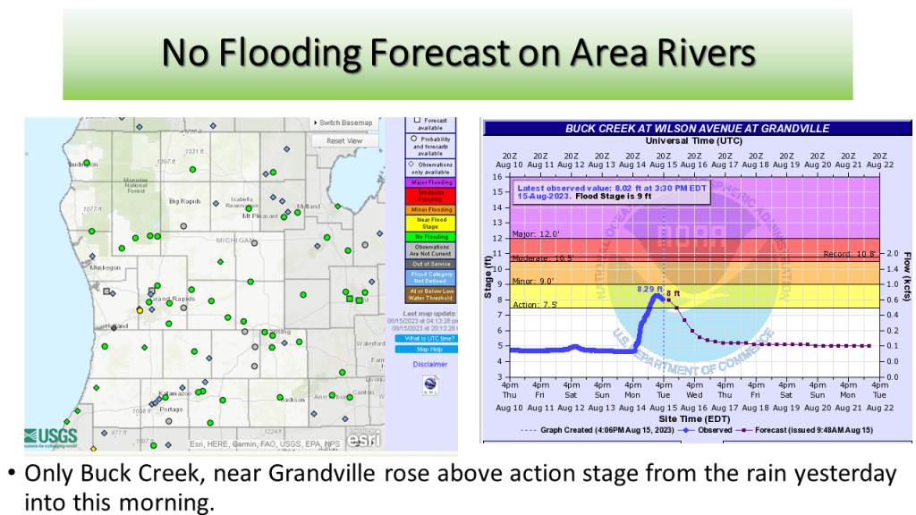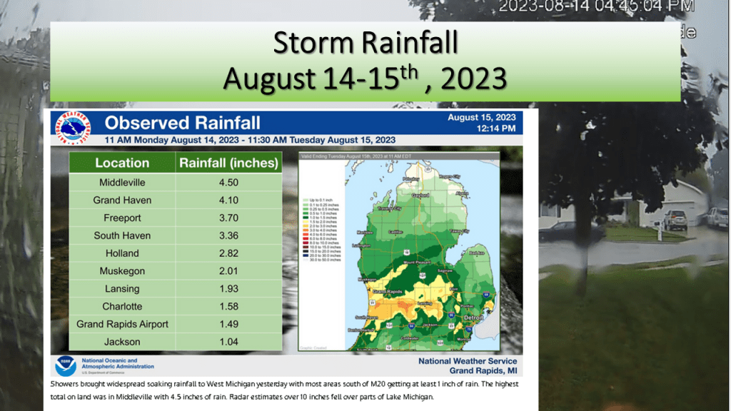 We forecast heavy rain between I-94 and I-96 and that is exactly what did happen. The heaviest rainfall report showed 4.50 inches in Middleville, most of that area had between 1″ and 3″ of rain from the event.