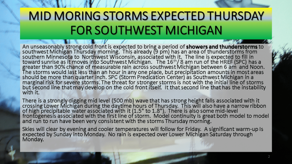 An unusually strong storm system for this time of year is expected to track east across Lower Michigan from Monday into Tuesday morning. This will be an occluded system, with the track of the surface low near I-94. It is typical for the heaviest precipitation to be within 100 miles of track of the surface low, but on the north it’s track. This system as a closed upper low with it and a coupled jet with it. The precipitable water reaches above 1.5 inches Monday afternoon over the southern 1/3 of Lower Michigan as this system tracks through the area. There is also good model continuity with this system so it gives me confidence that the heavy rainfall will happen. Just exactly were is questionable but I would have to believe between I-94 and Route 10, between Monday afternoon and Tuesday morning a large part of that area should see more than an inch of rainfall.