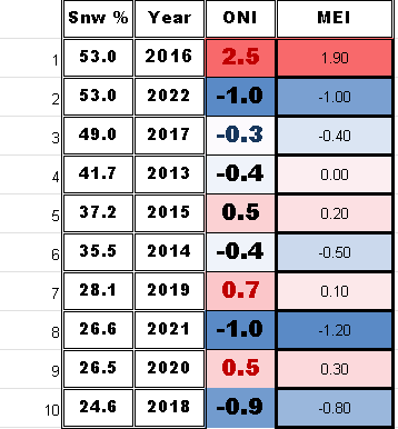 I have updated this to show the percent snow cover and ENSO state for each of the 10 years. At the end I have 2 tables that show the years with the ENSO index numbers and the snow cover for that Christmas. The bottom table sorts the percent snow cover from highest to lowest to see if there is a correlation between the ENSO state and the percent snow cover on Christmas day.