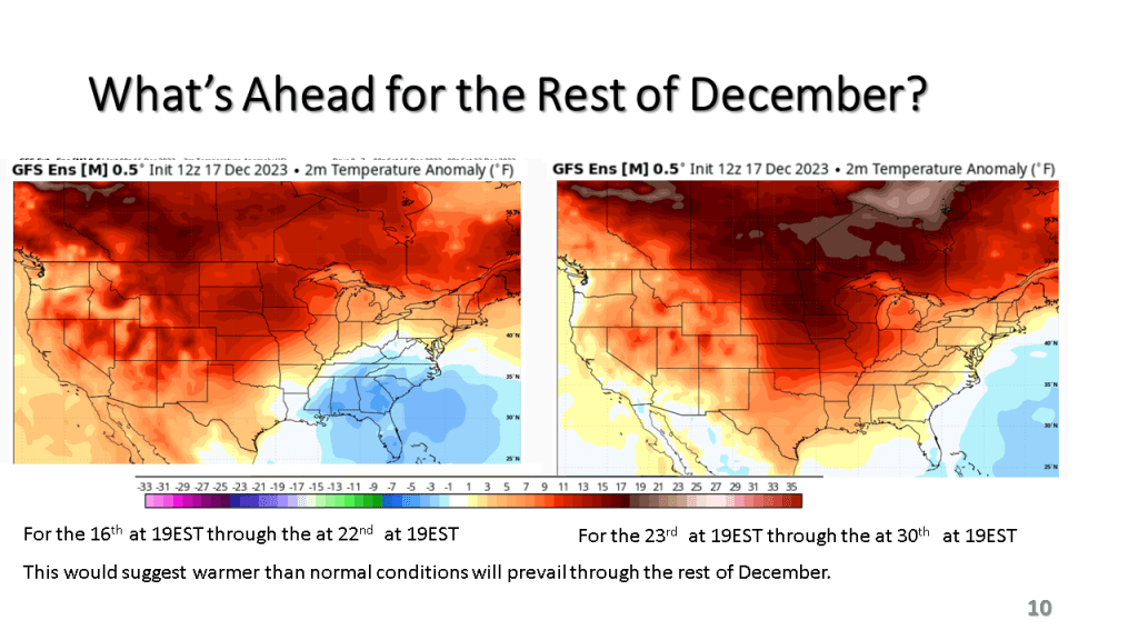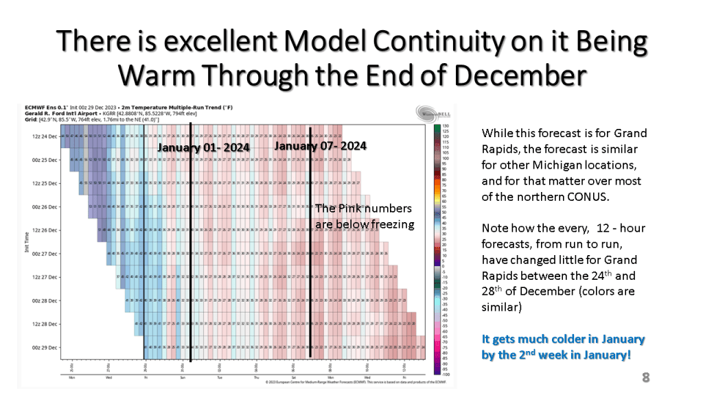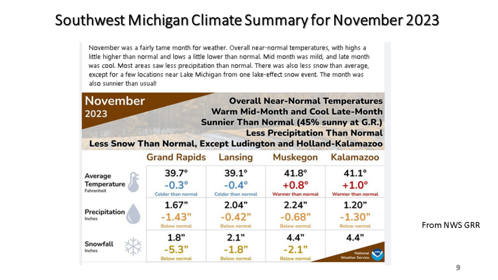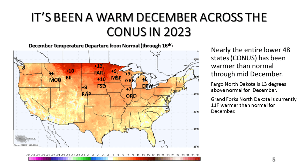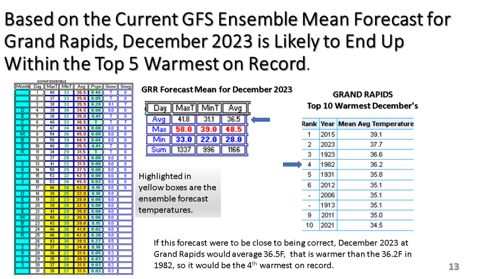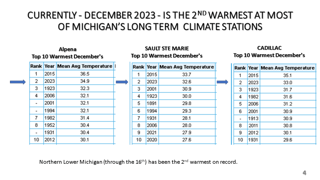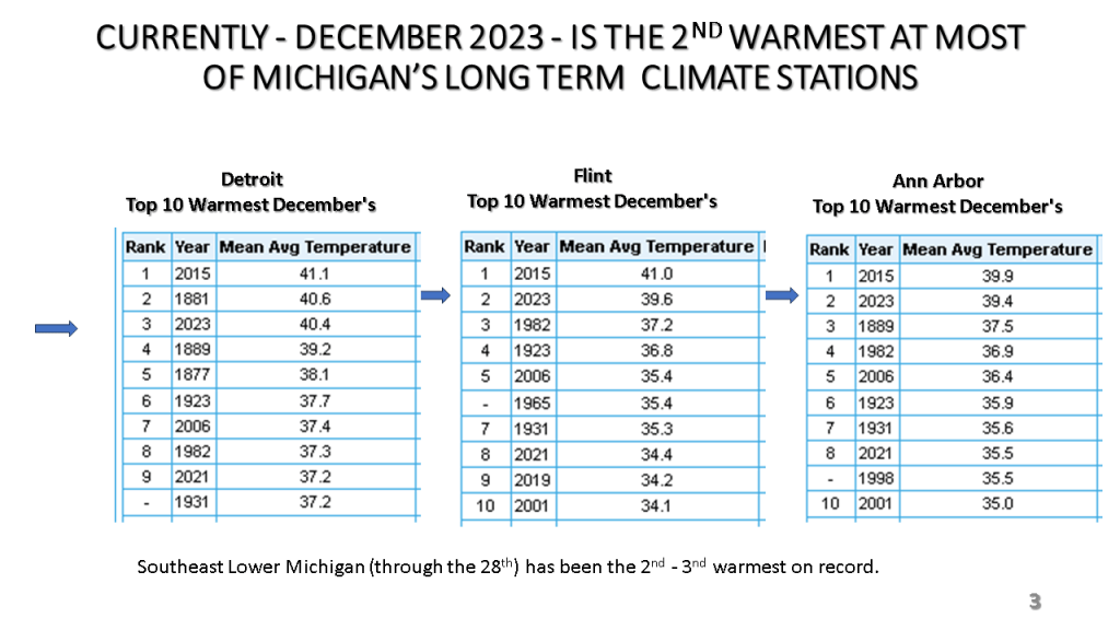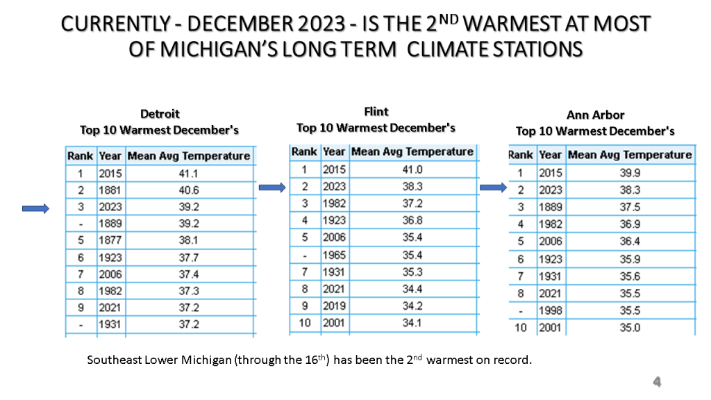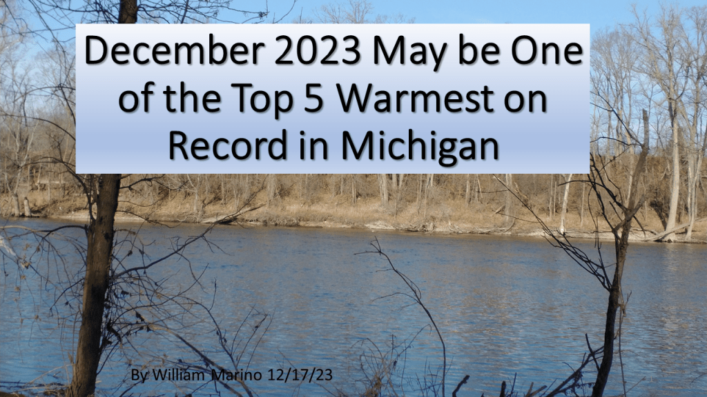 So far, as of the 16th, December is averaging 6 to 8 degrees above normal across Southern Lower Michigan. Flint is warmest with +7.8, while while Grand Rapids is the least with +5.5. Most other climate sites are between 6 and 7 degrees warmer than normal through the 16th in Michigan. Over northern Michigan Alpena has the least positive departure with +4.1 while Gaylord is +5.9 and Traverse City is +5.1. We are expecting two cold days (Monday and Tuesday) but the rest of December is expected to well above normal. Thus, December 2023 is likely to be in the top 5 warmest on record over most of Lower Michigan.
