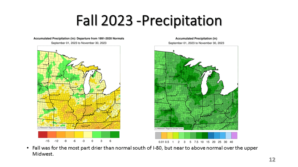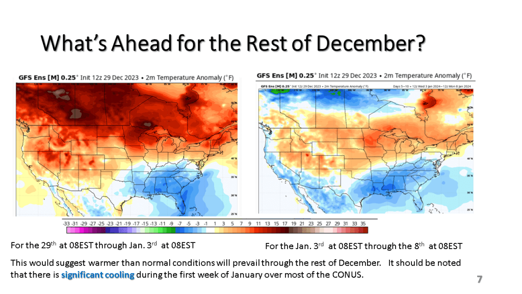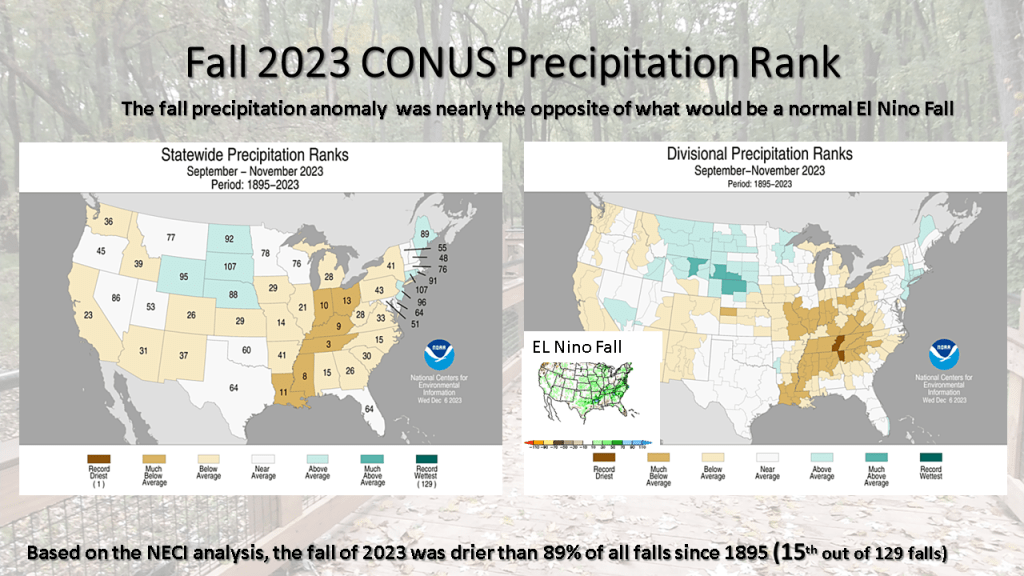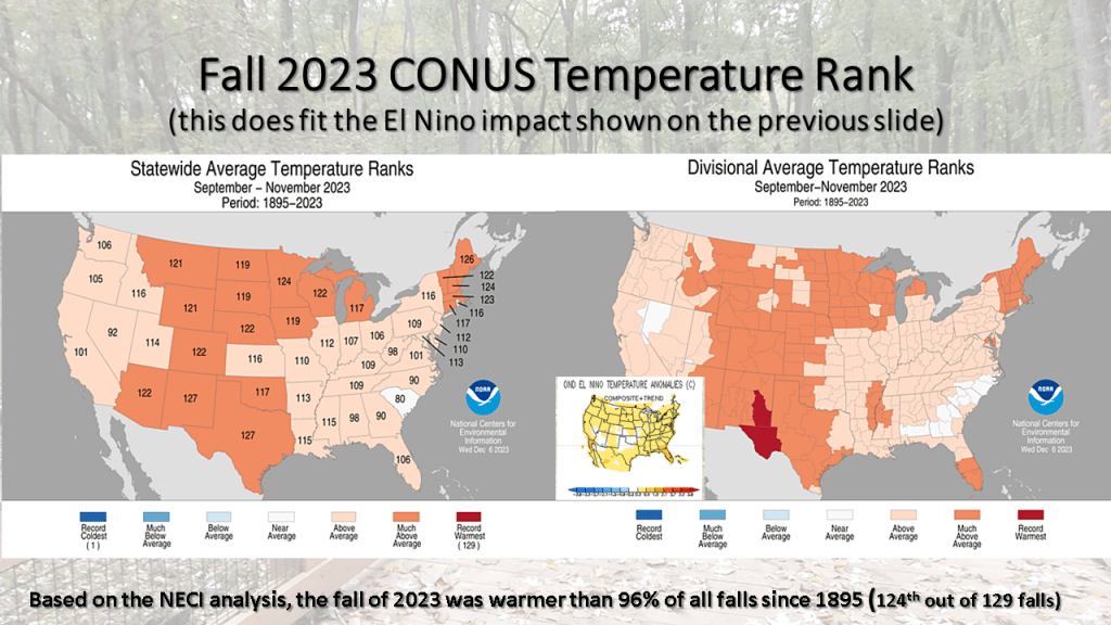 In our string of nationally much warmer than normal seasons, the fall of 2023 was 124th out of 129 falls for warmer than normal. This puts this fall warmer than 96% of all falls since 1895! No area of the CONUS had a below normal temperatures (bottom 1/3 coldest) this fall.