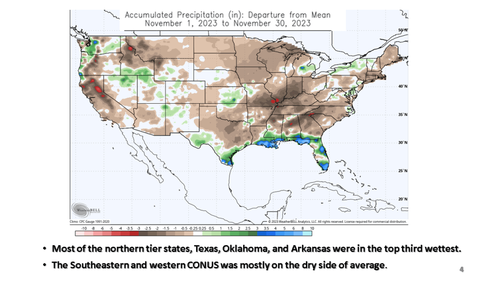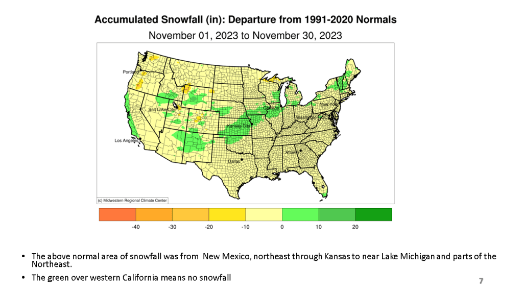 For the most part, November was not was warm, relative to normal as October was, in fact the eastern half of the CONUS was cooler than normal in November, as were parts of the Pacific Northwest. It was an extremely dry month over most of the CONUS, ranking 111th dries out of 128 years (91%). Only the Gulf Coast and Florida were wetter than normal. Snowfall was mostly below normal but a snow storm brought heavy snow from Kansas to near Chicago around the 25th resulted in up to a foot of snow in that area, bringing them above normal snowfall for November.