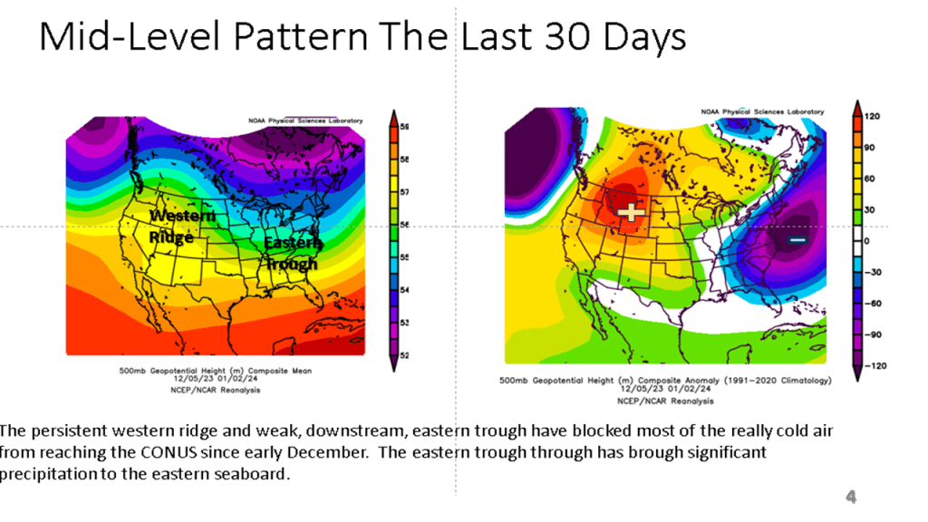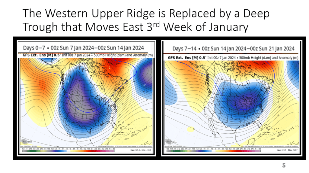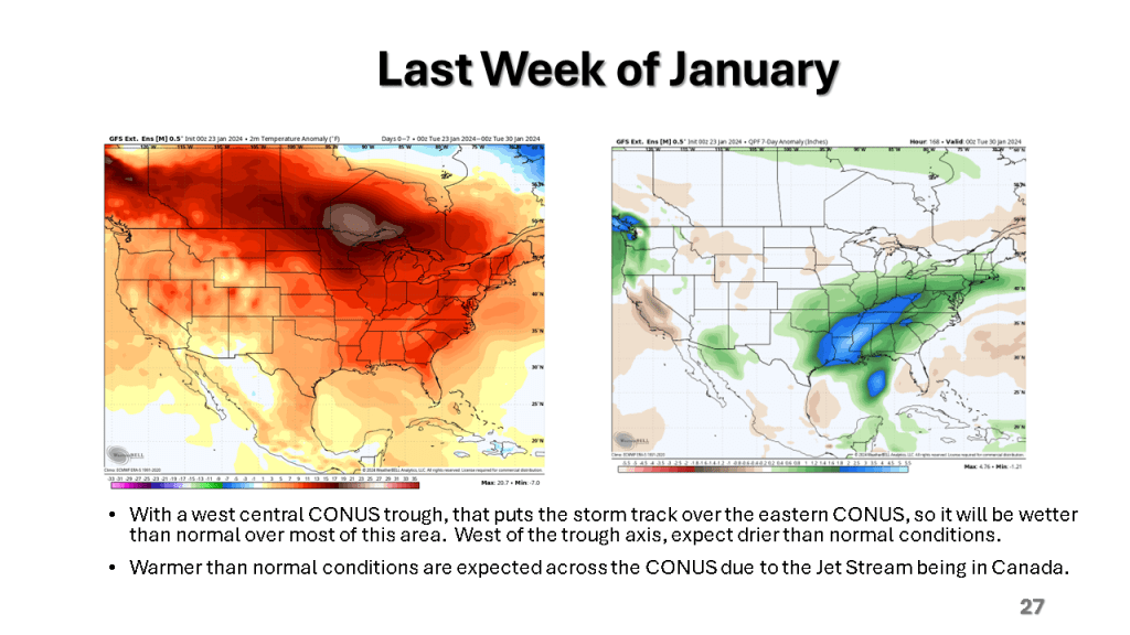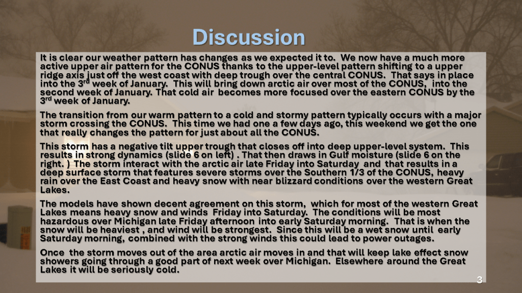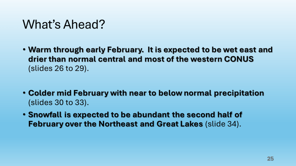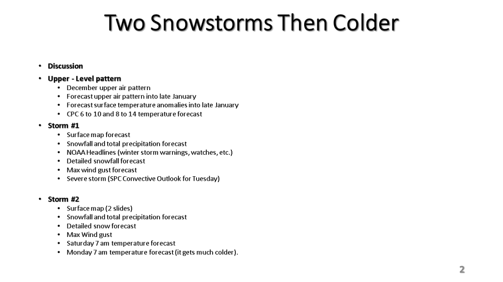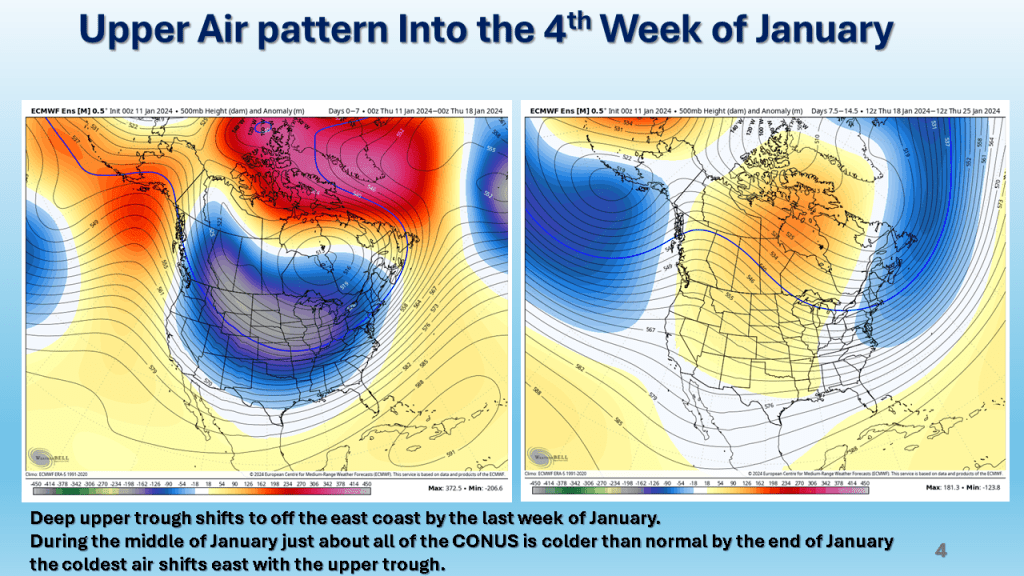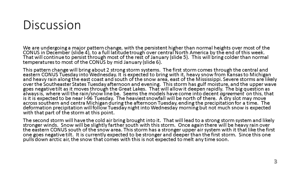 In Conclusion, the storms we will see over the central and eastern Untied States between now and Wednesday are the forerunners of a major change in the weather pattern over the CONUS. That past month or so was mostly warmer than normal over nearly all of the CONUS, with just the southeast sections near to below normal. From the second week through the third week in January we will see much colder weather from the west coast to the east coast and the wet pattern will expand into the central United States. Snow will likely be on the ground over most locations north of Indianapolis by the end of next week.
