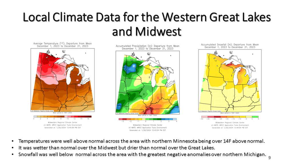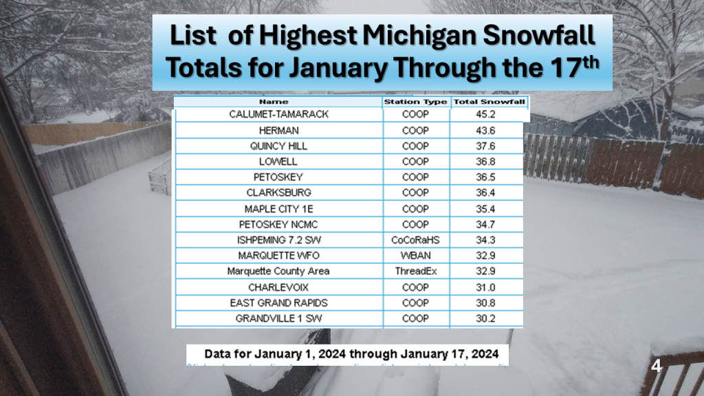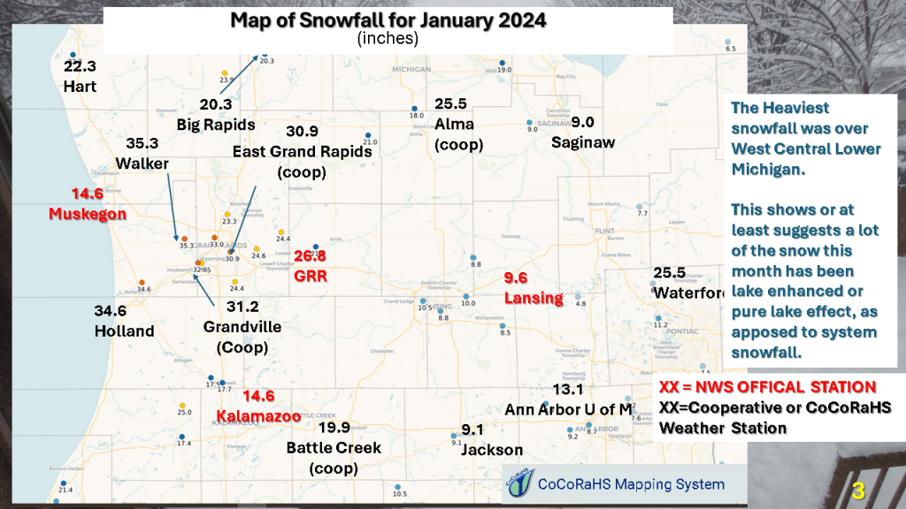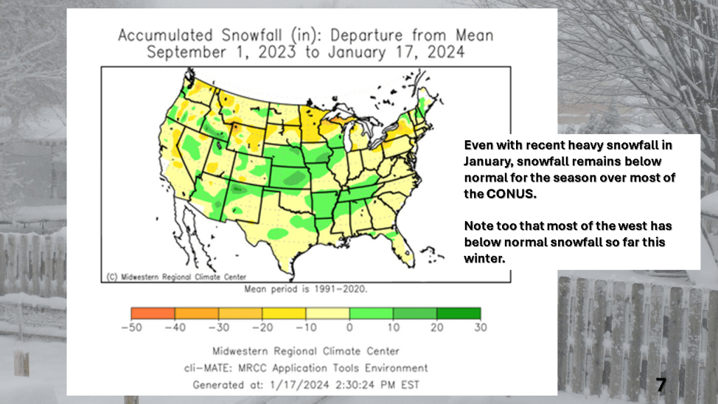Over Michigan, November and December featured well below normal snowfall. The first 2 1/2 weeks of January seem to be making up some of that deficit. Over the rest of the CONUS, seasonal snowfall mostly remains below normal.