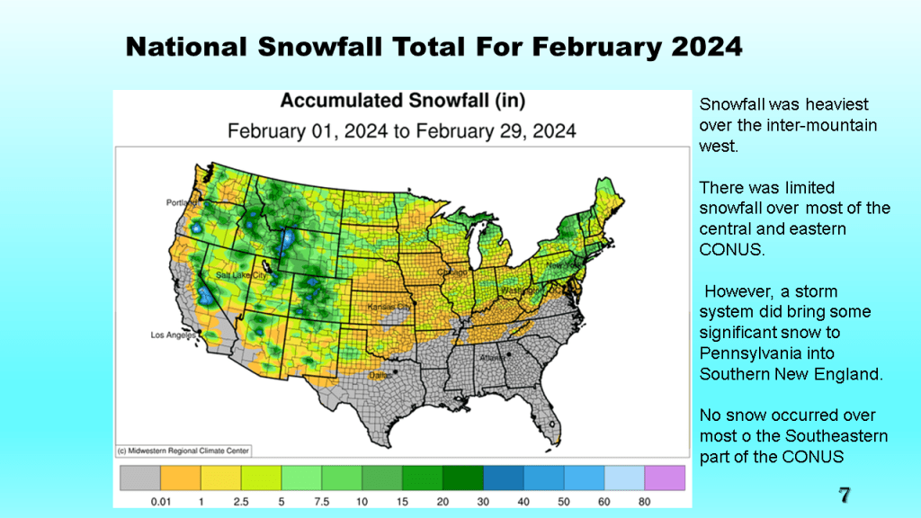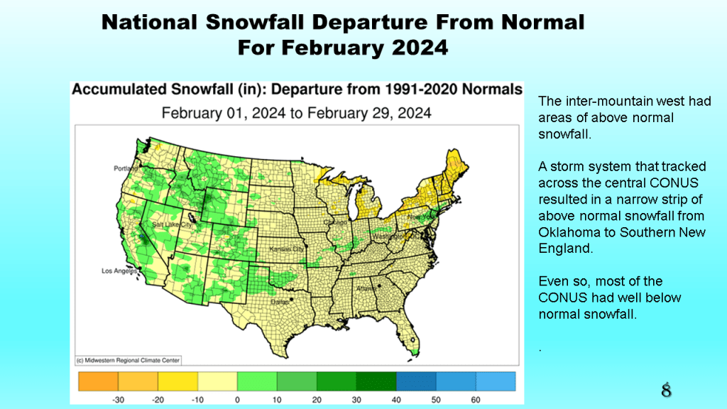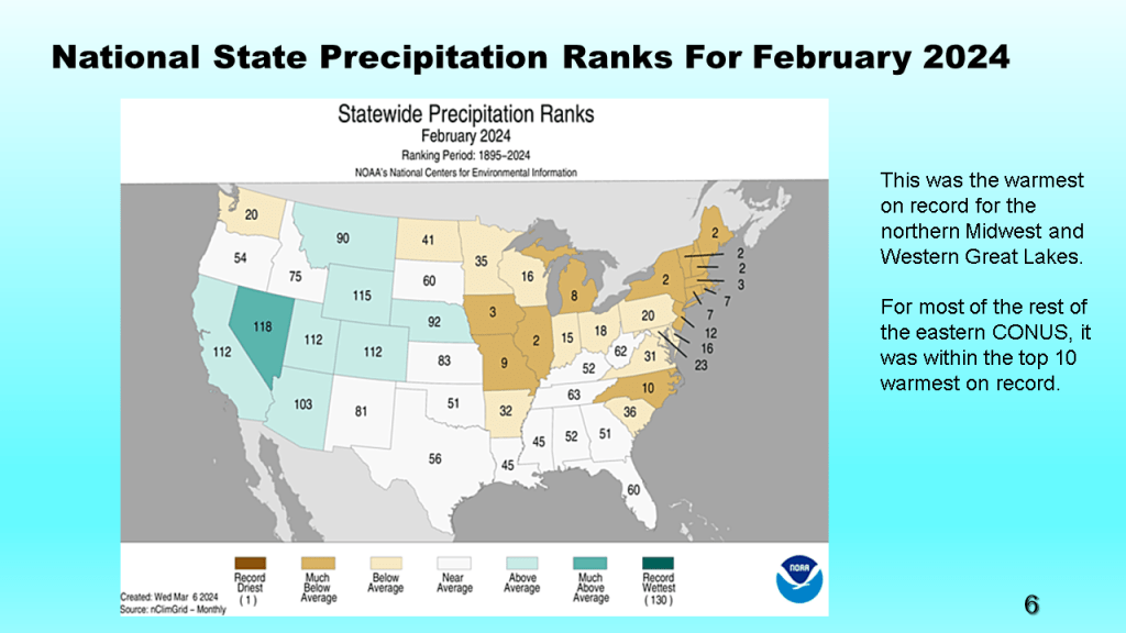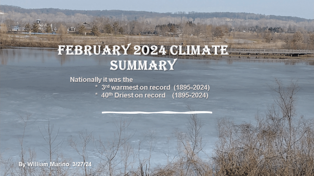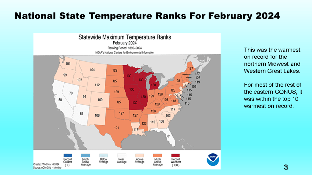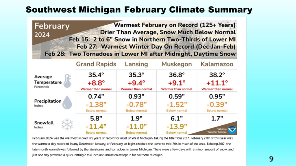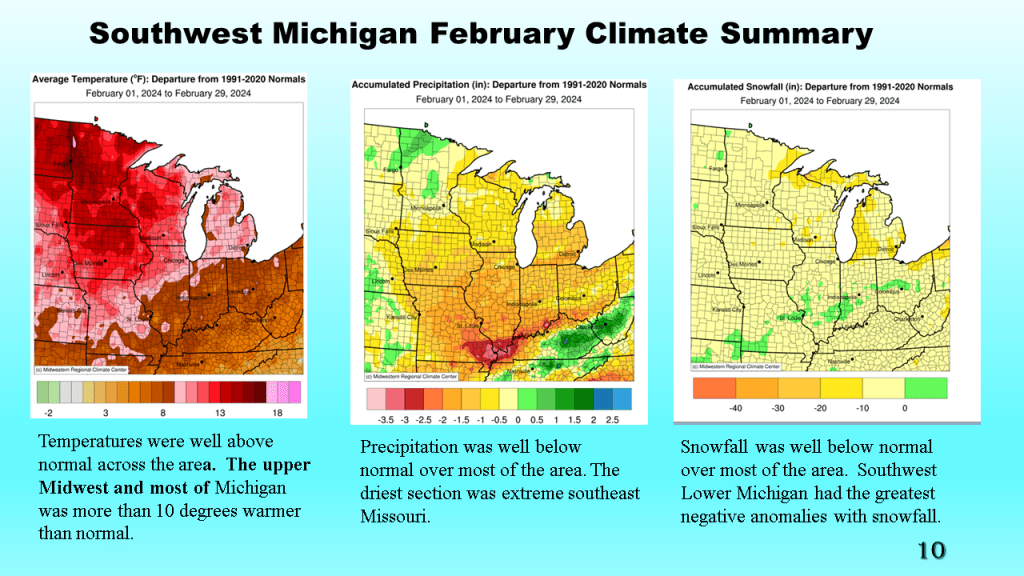 For Southwest Michigan, this was the warmest February on record. Both the total precipitation and snowfall were well below normal. Nationally this was the 3rd warmest and 40th driest on record.