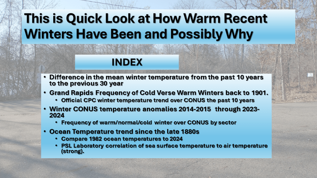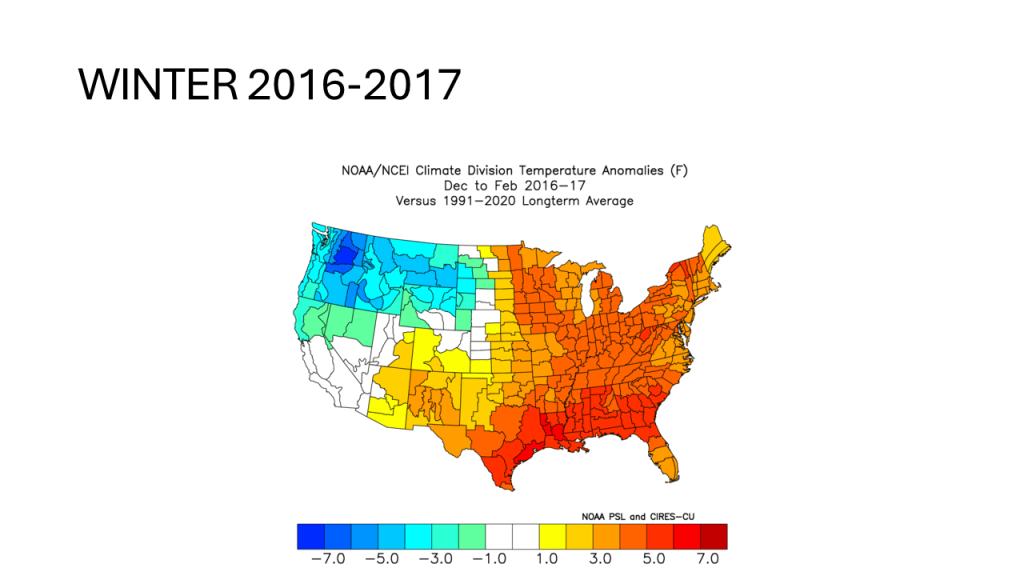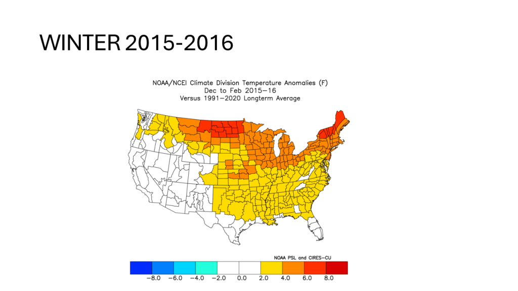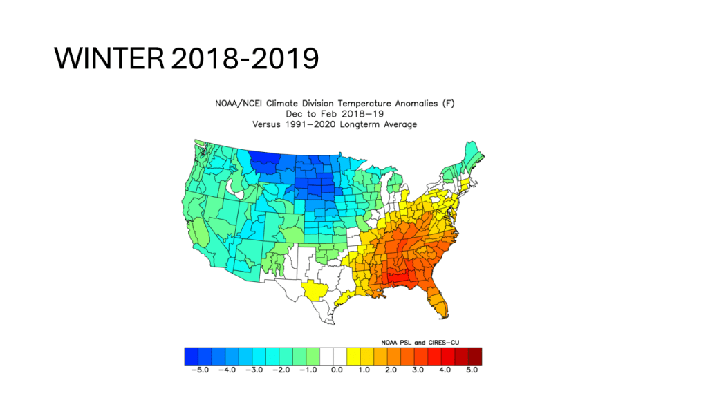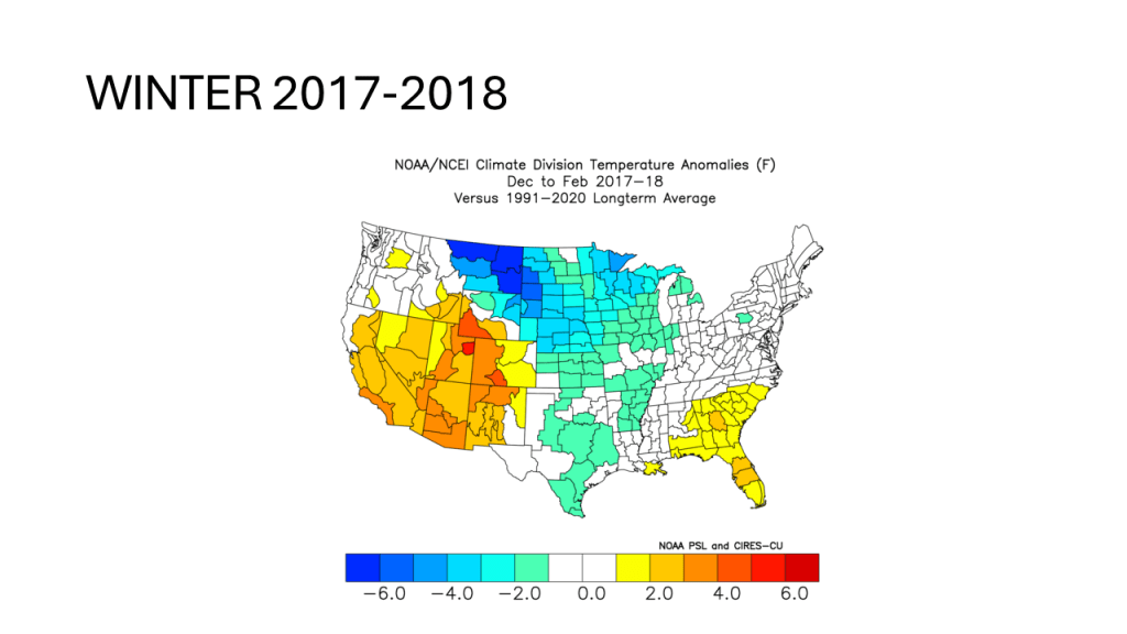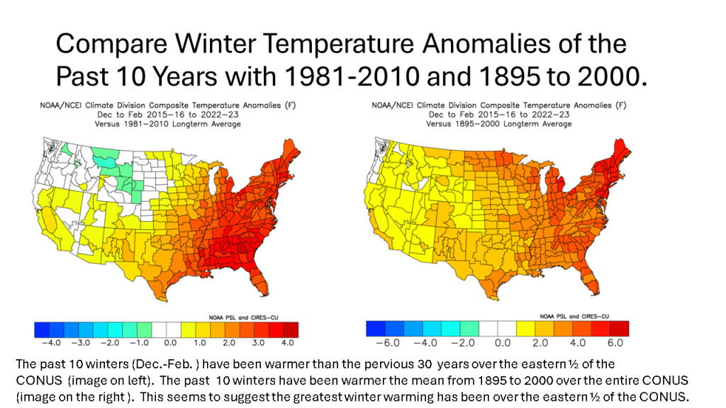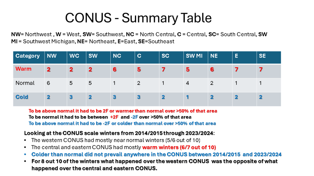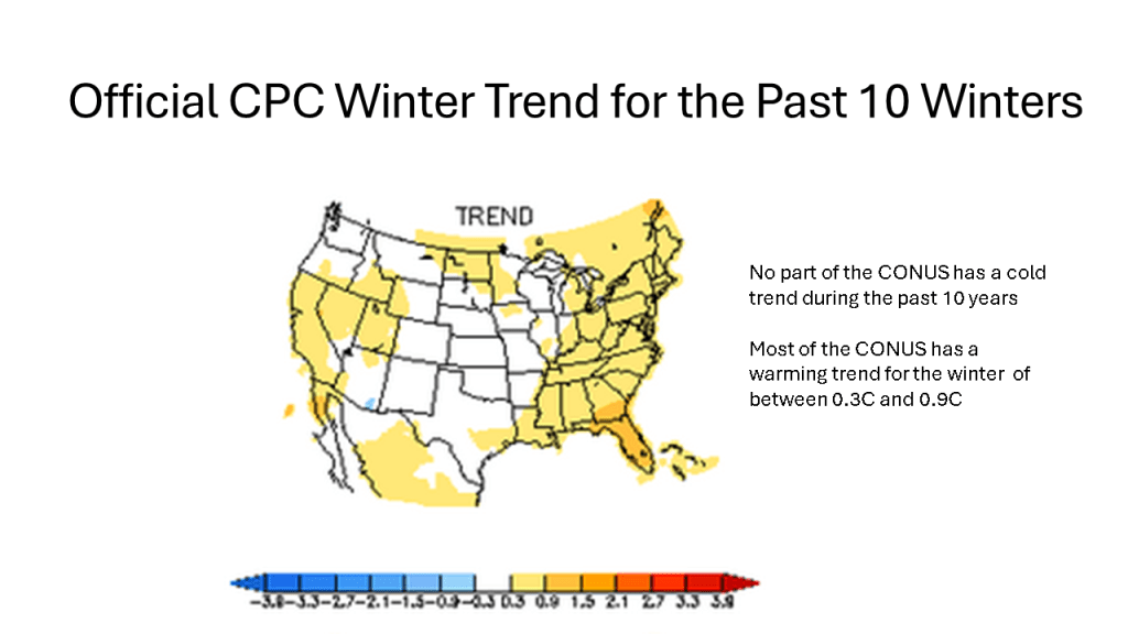 This is an update to what I did yesterday but with a lot more detail. I have added CONUS scale winter temperature anomalies for each of the past 10 years so you can see for yourself, in your area how the cold winter frequency has changed (there is a summary CONUS scale summary table for this now too). I have added correlation slides from CPC and Physical Science Laboratories to show there really the correlation I am suggesting is true.