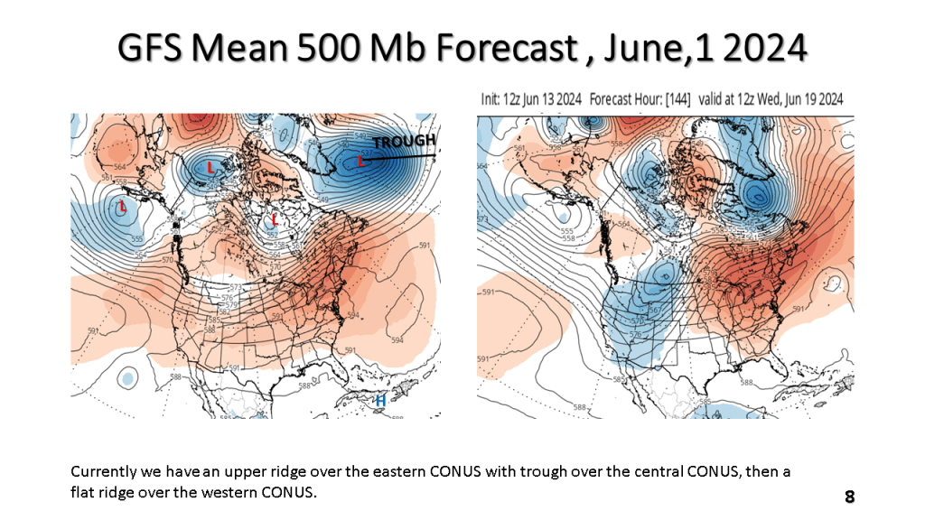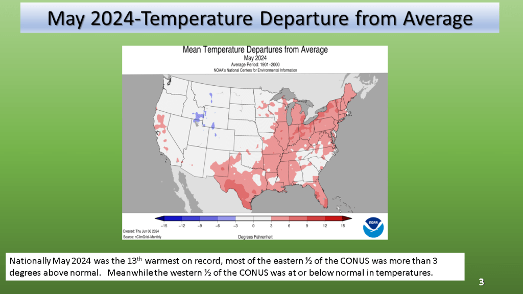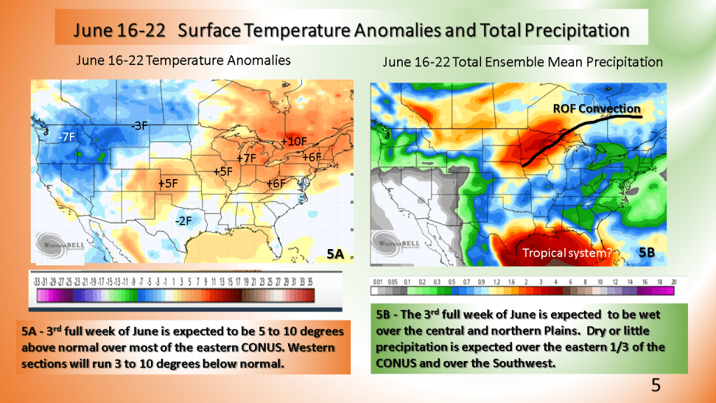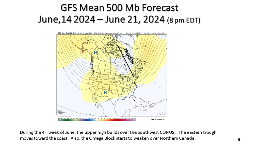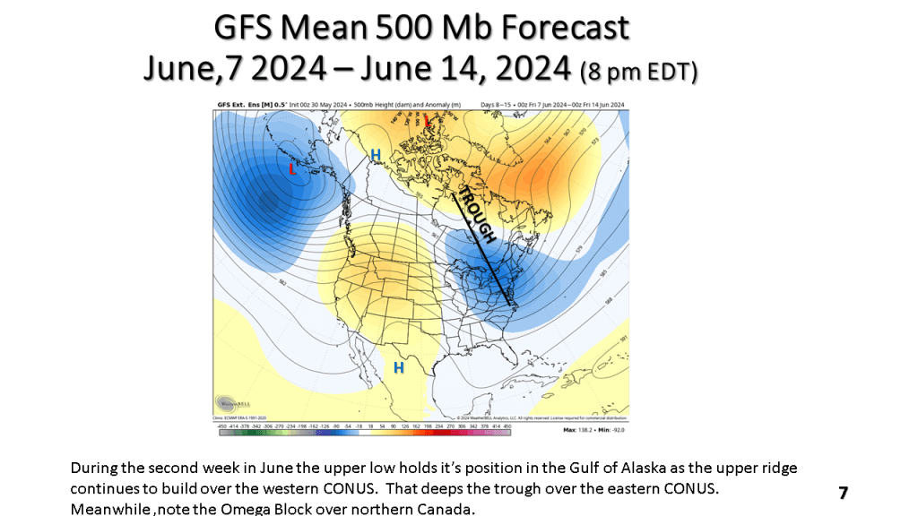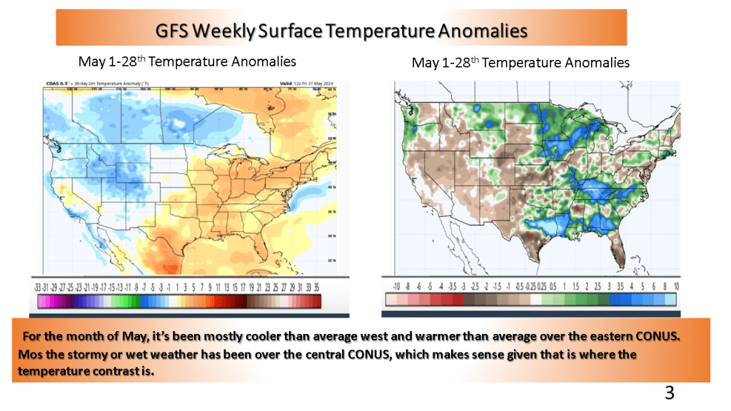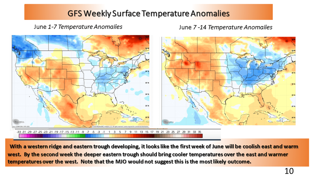 This would suggest cooler than normal over the eastern CONUS and warmer than normal over the western CONUS. The wet weather over the central CONUS may last into the first week of June but most of the rest of June is expected to feature near to below normal precipitation.