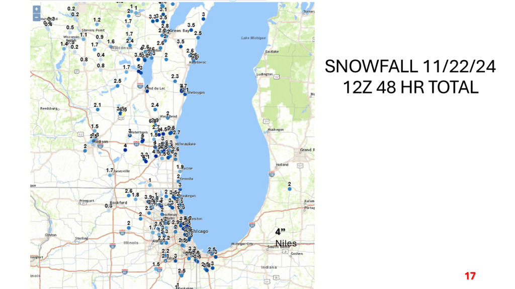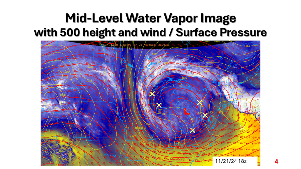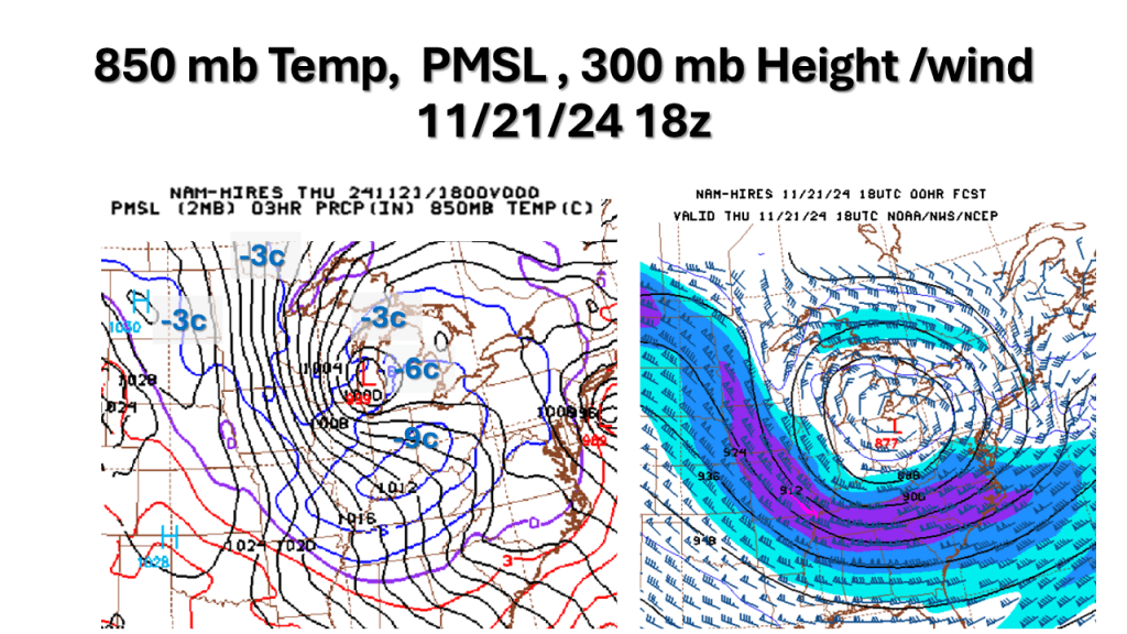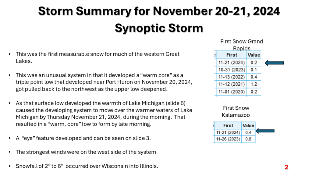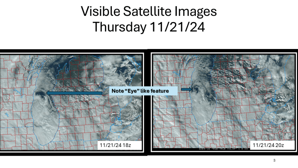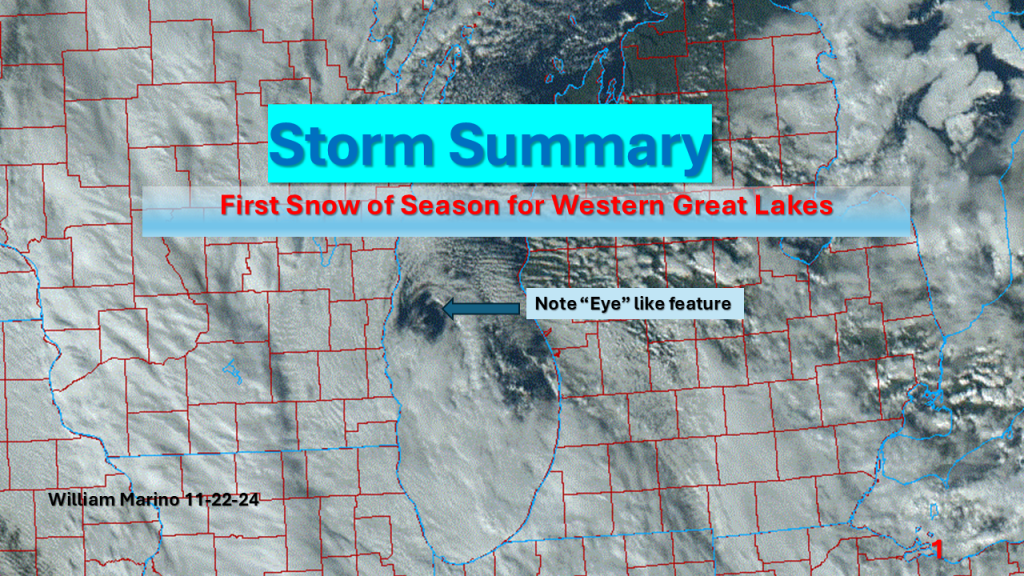 A strong November storm system brought the first snow of the season to parts of the western Great Lakes. Due to the warmth of Lake Michigan and that the surface low moved over Lake Michigan it developed an “Eye” like feature during the afternoon of Thursday, November 21, 2024.