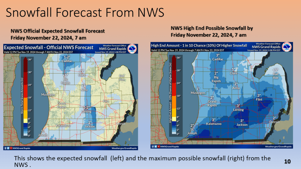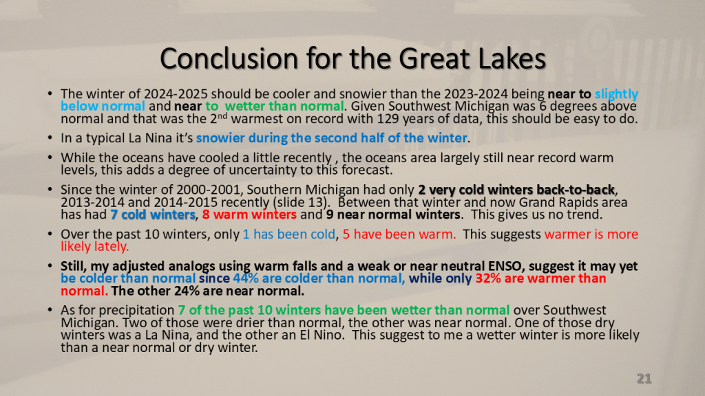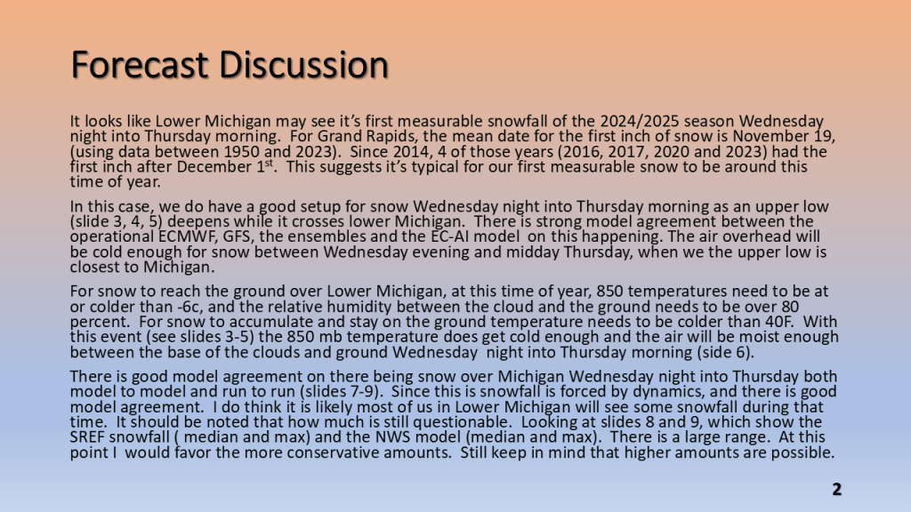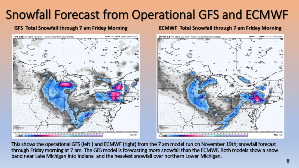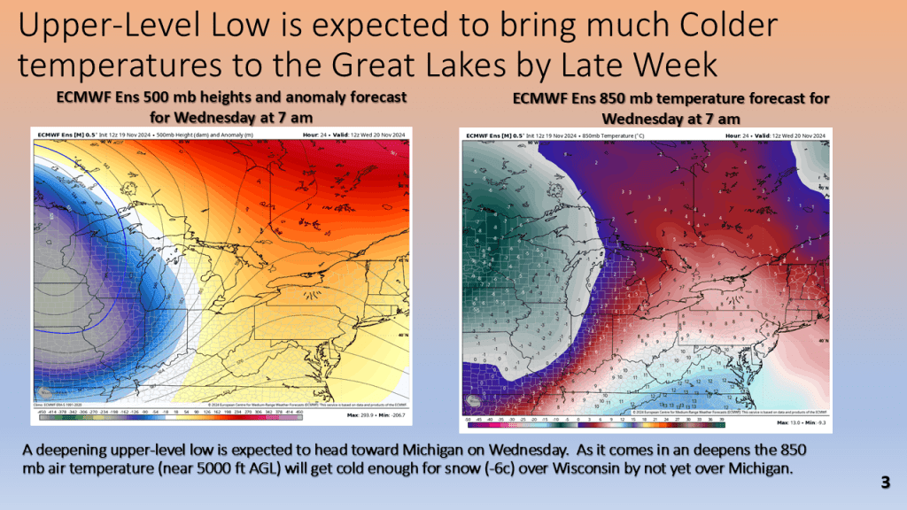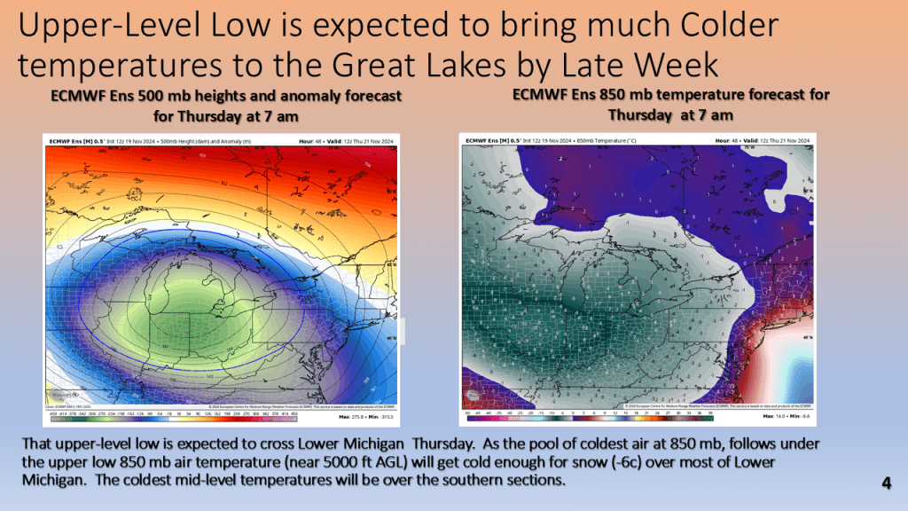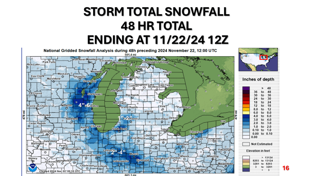 A strong November storm system brought the first snow of the season to parts of the western Great Lakes. Due to the warmth of Lake Michigan and that the surface low moved over Lake Michigan it developed an “Eye” like feature during the afternoon of Thursday, November 21, 2024.