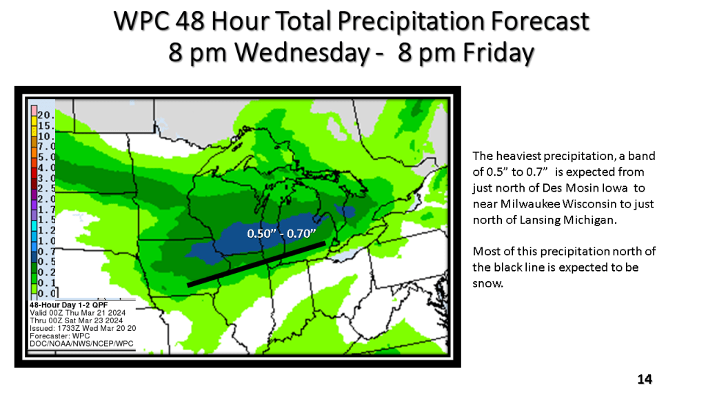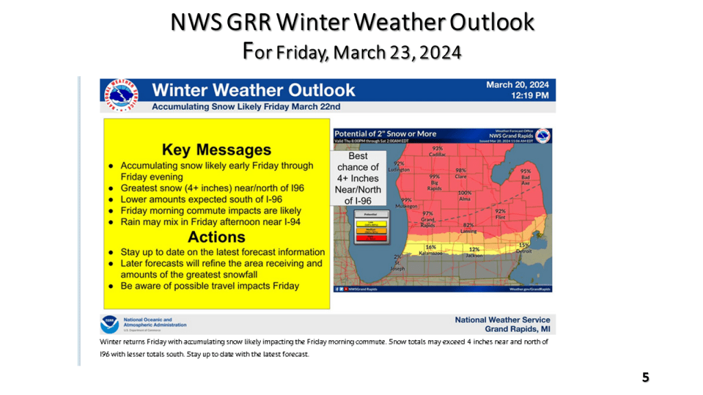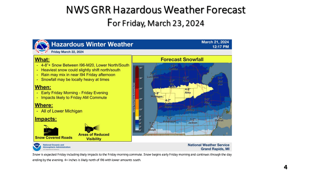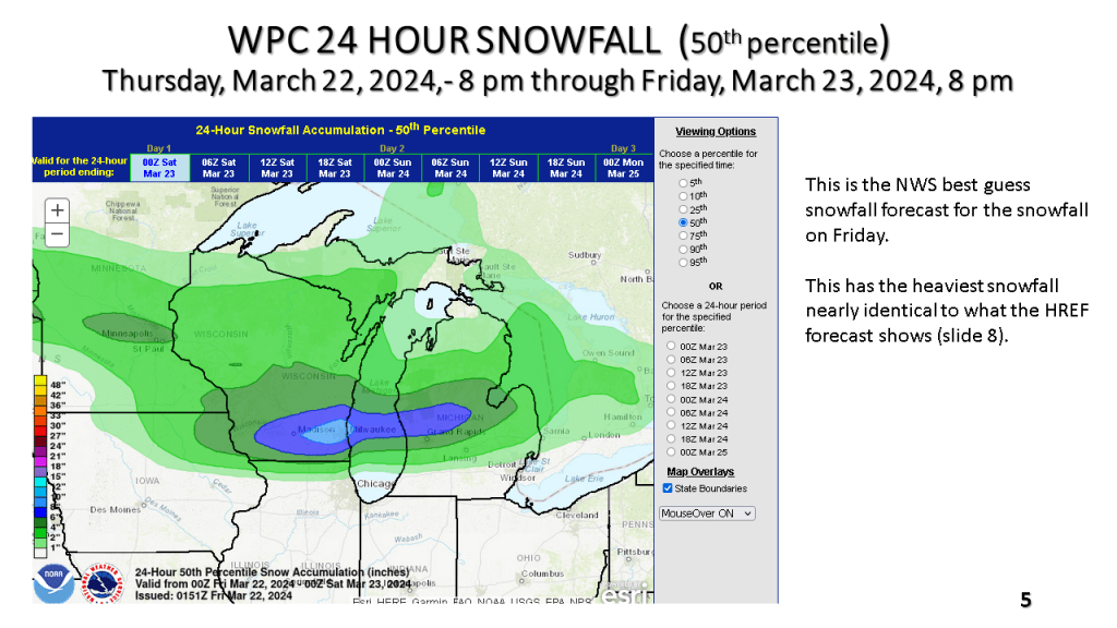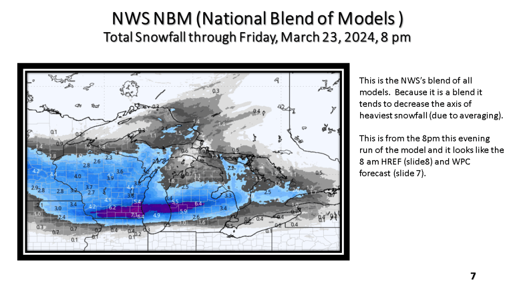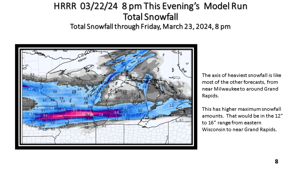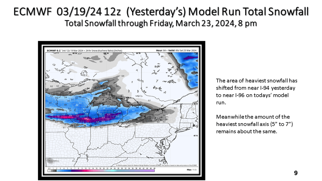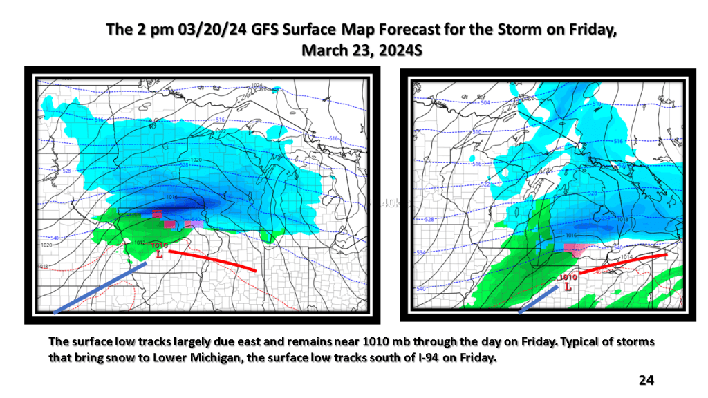 A narrow band of snowfall greater than 6″ in 12 hours is expected about 100 miles north of the track of the surface low. That would be near or just north of I-96 in Michigan. Snowfall rates in the heaviest snow area will be high enough to accumulate during the daytime, even in late March.
