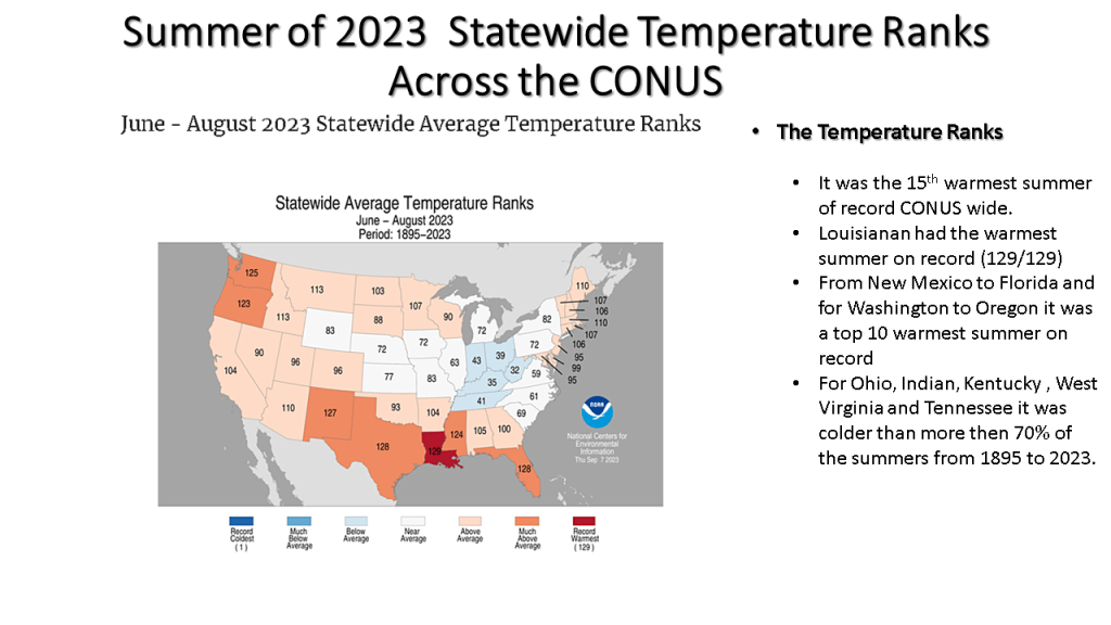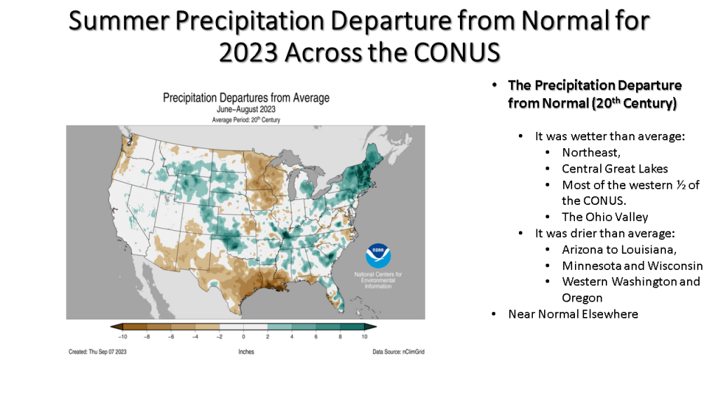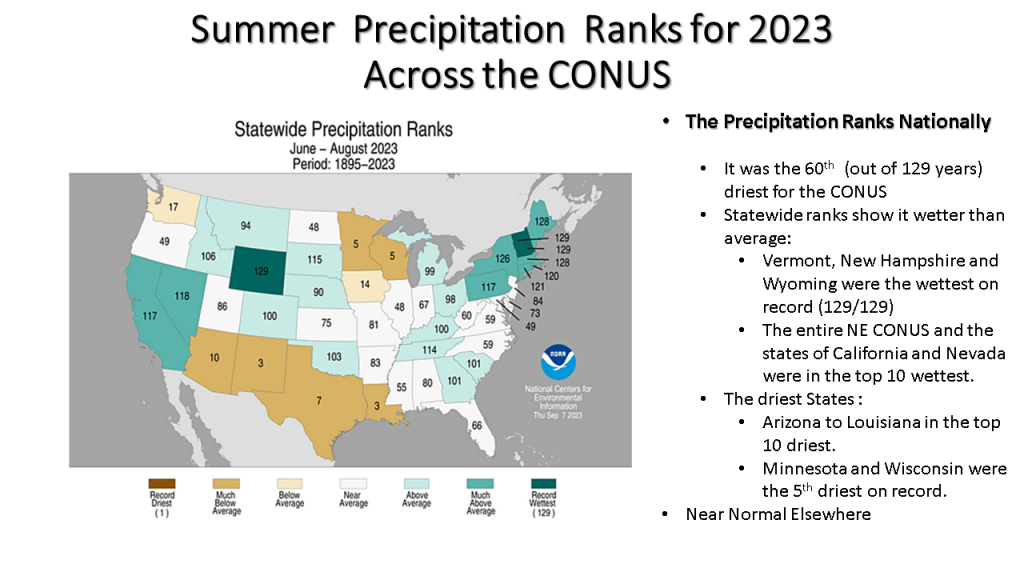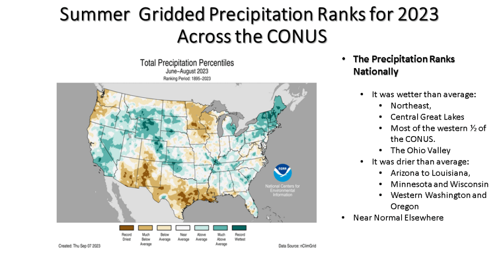 Here I have the frequency for highs in the 90s across the CONUS (Continental United States), the longest streak across the CONUS, the frequency of lows of 70 or more and I few more NCEI charts to show how hot of a summer this was both nationally and regionally. I also have a few precipitation maps so you can see that the great frequency for hot weather was were it rained less, relative to normal for that area.