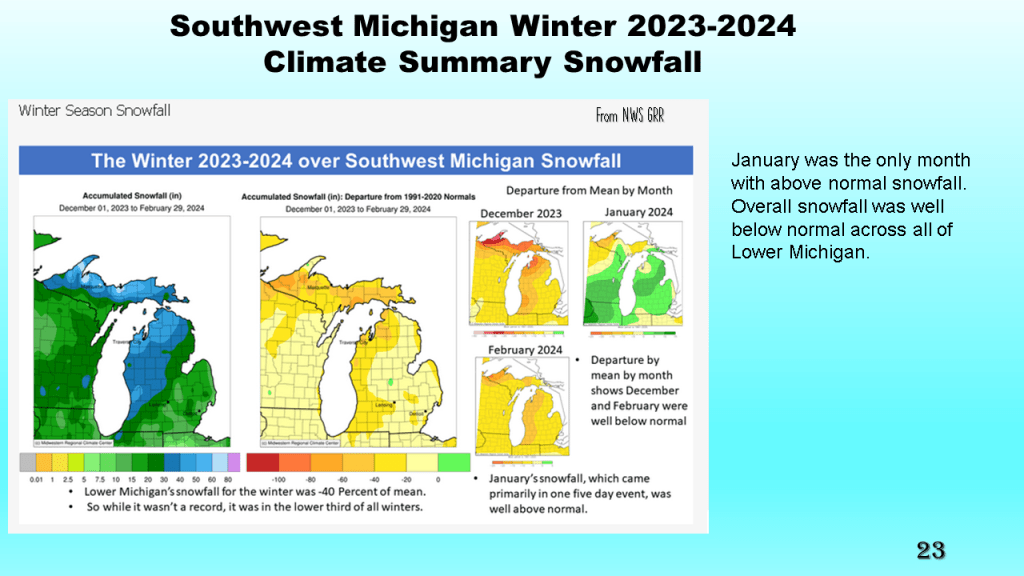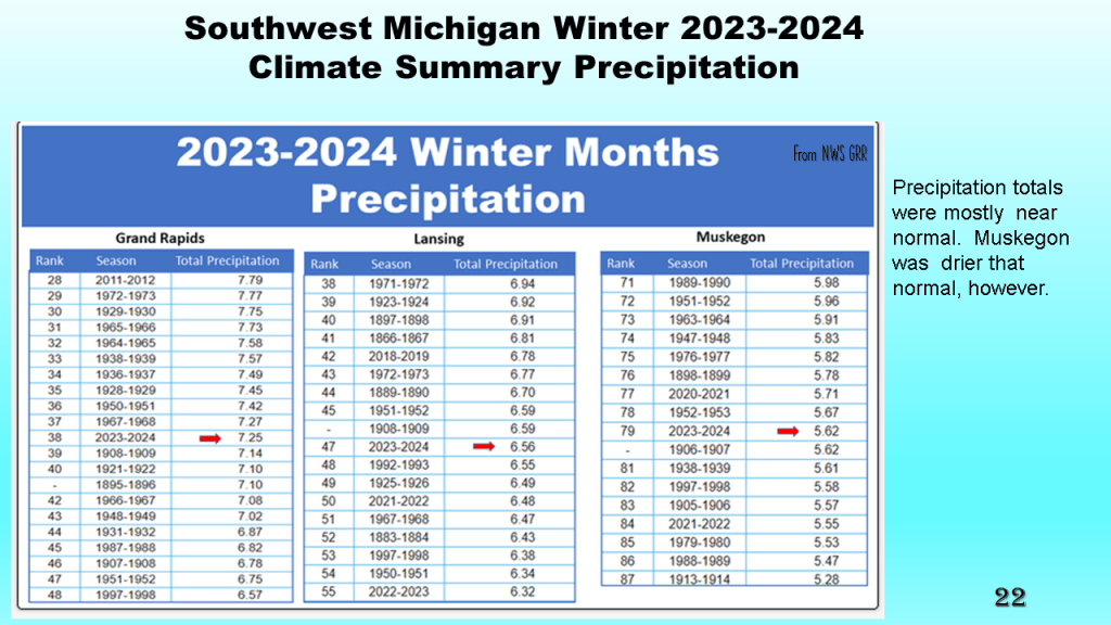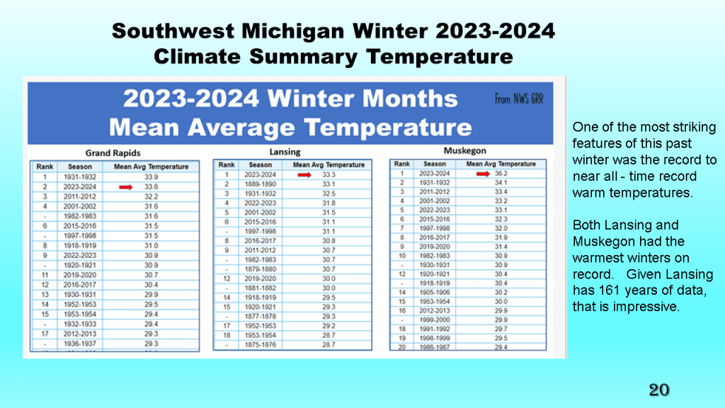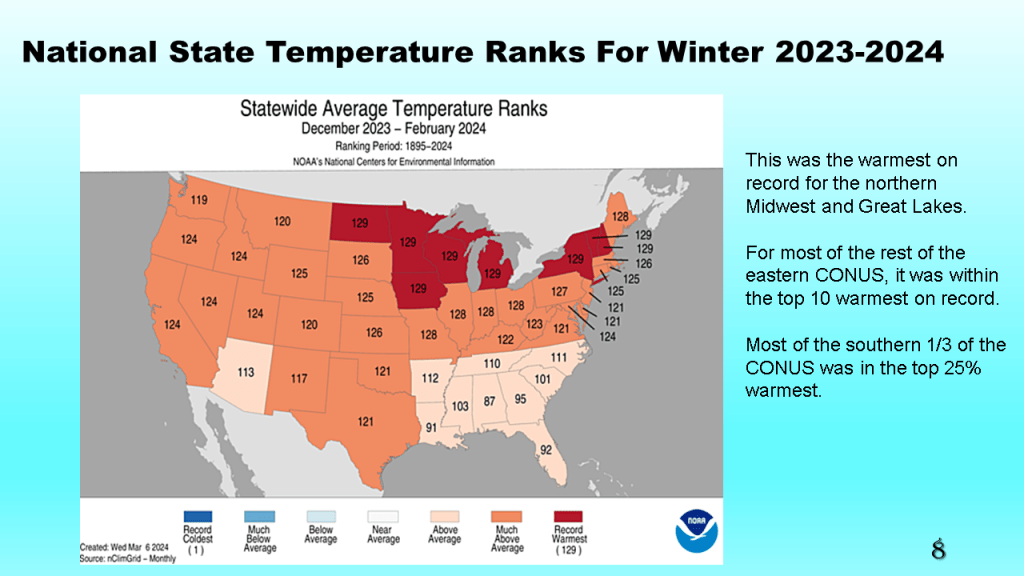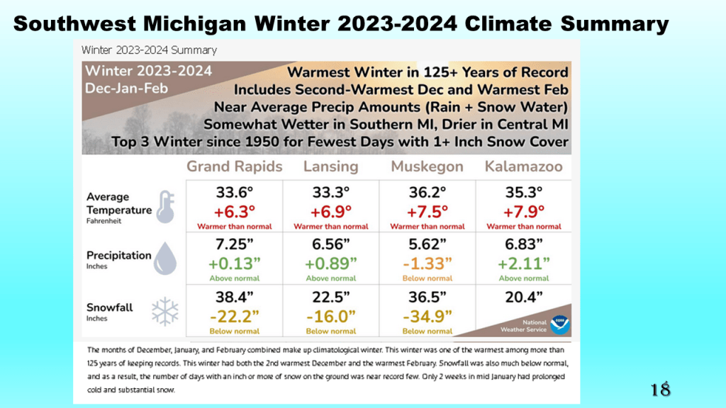 This was both nationally and locally one of the warmest winters on record, with records going back to 1895. Nationally and locally snowfall was below to well below normal. Precipitation was mostly near normal.