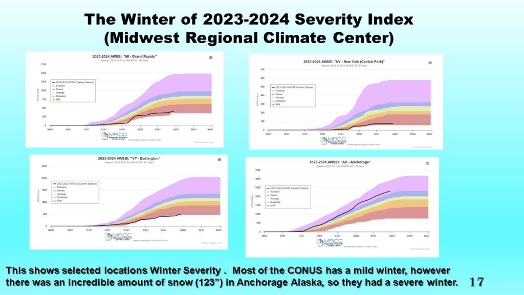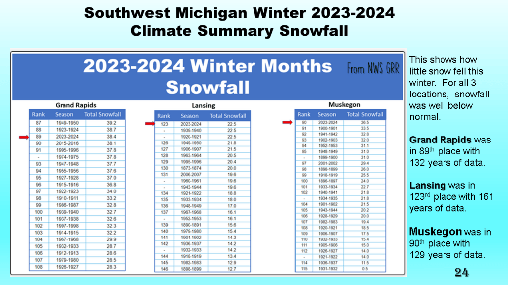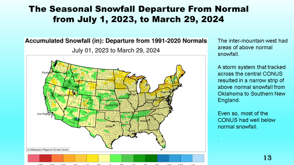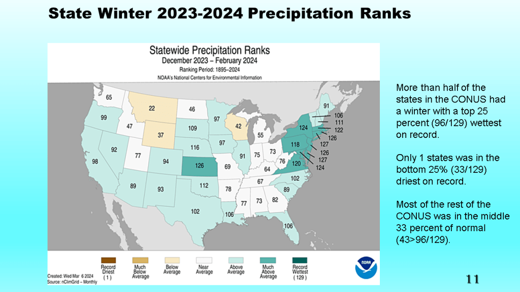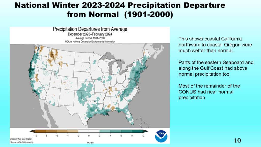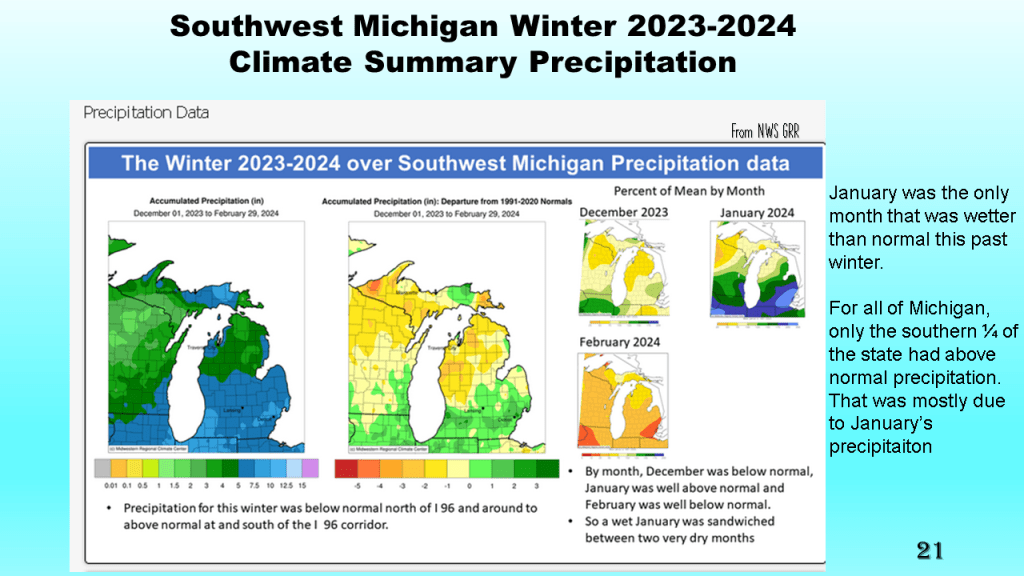 This was both nationally and locally one of the warmest winters on record, with records going back to 1895. Nationally and locally snowfall was below to well below normal. Precipitation was mostly near normal.