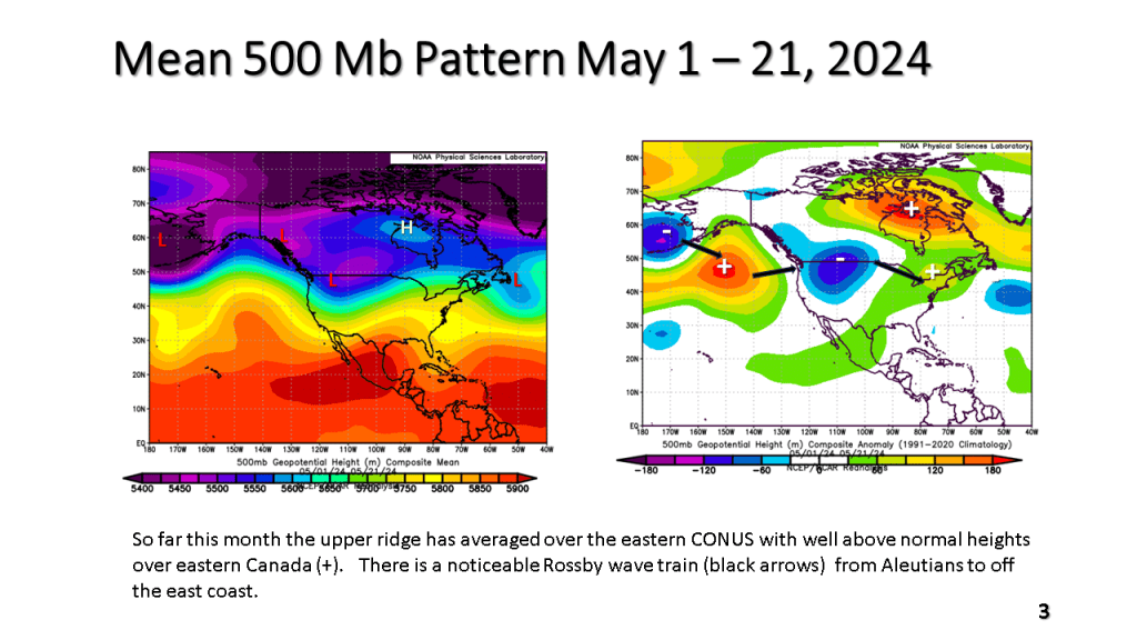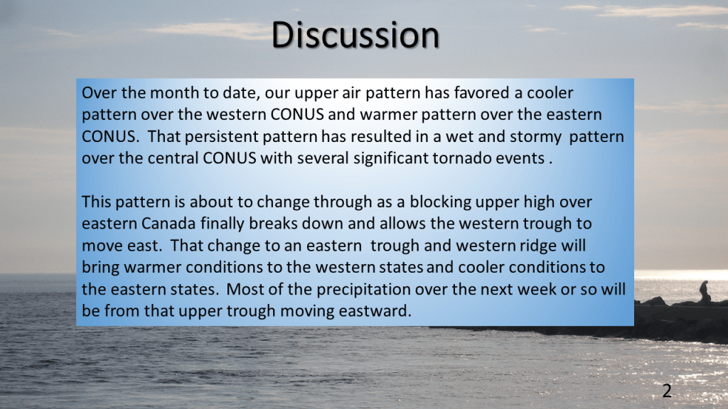 This would suggest cooler than normal over the eastern CONUS and warmer than normal over the western CONUS. The wet weather over the central CONUS may last into the first week of June but most of the rest of June is expected to feature near to below normal precipitation.