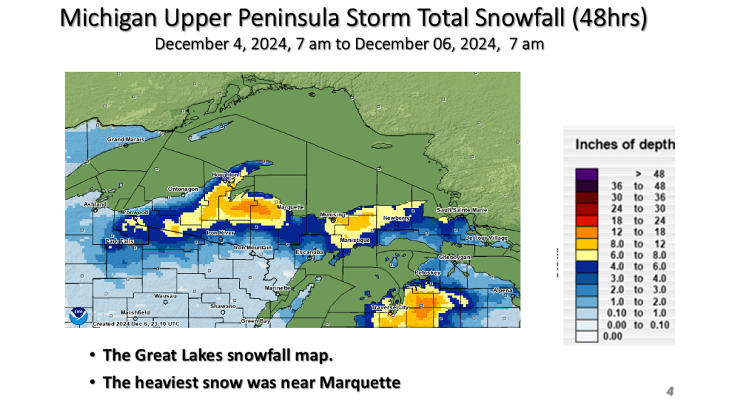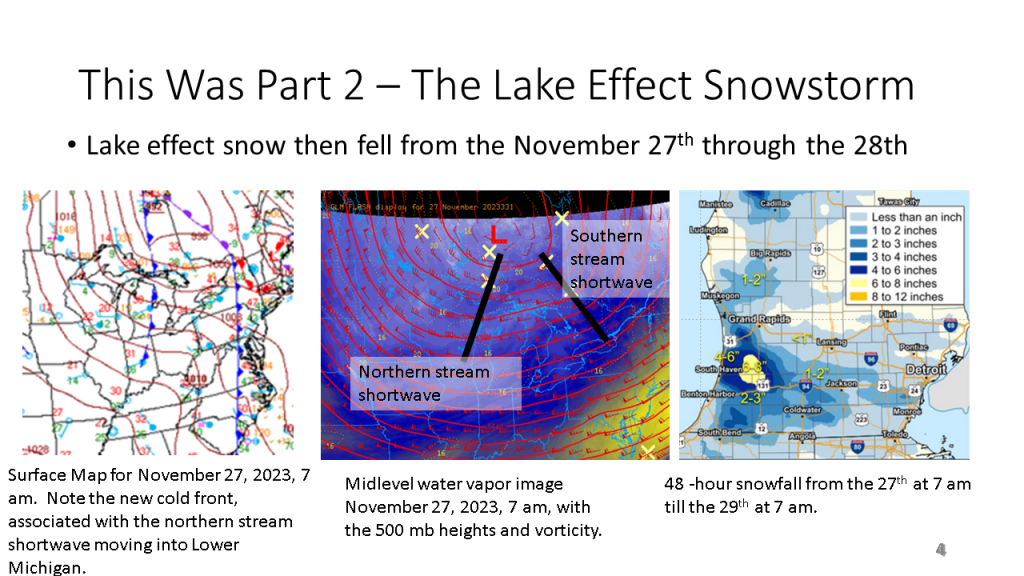 There was a southern stream shortwave that brought 1 to 3 inches of snow to the southern Great Lakes on Sunday. However most of the snow fell from lake effect as the coldest air of the season crossed the relatively warm water of the Great Lakes (mostly in the 40s) Monday into Tuesday. The heaviest snowfall was were the west to northwest wind was forced up-slope over northern Lower Michigan but even more so over the Tug Hill Plateau of western New York were over a 1 1/2 feet of snow fell.