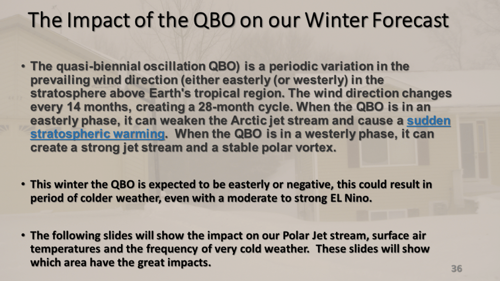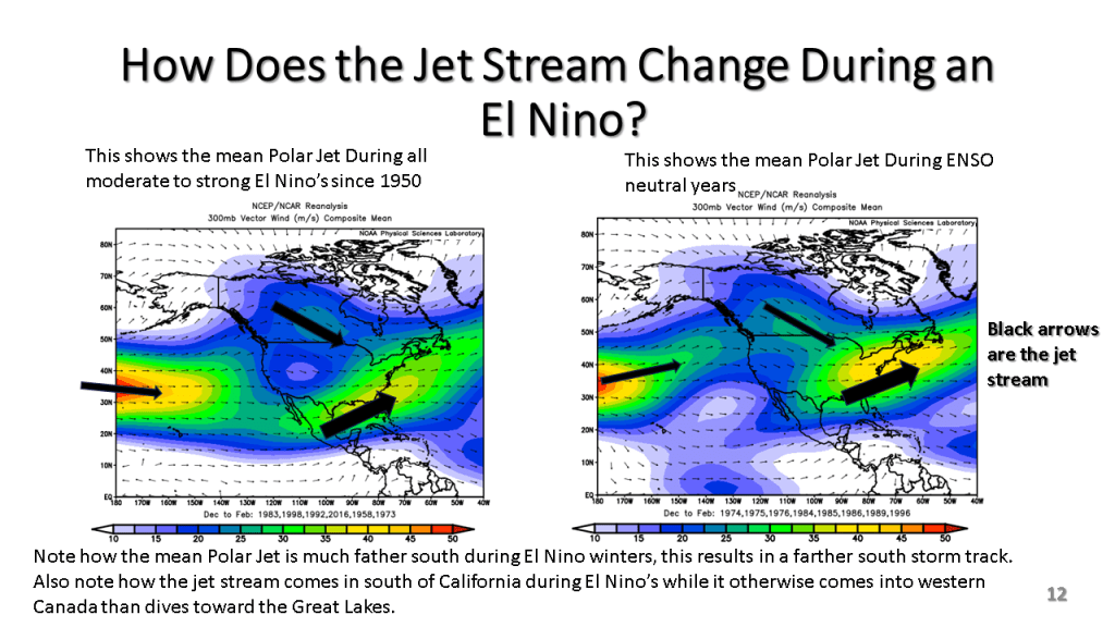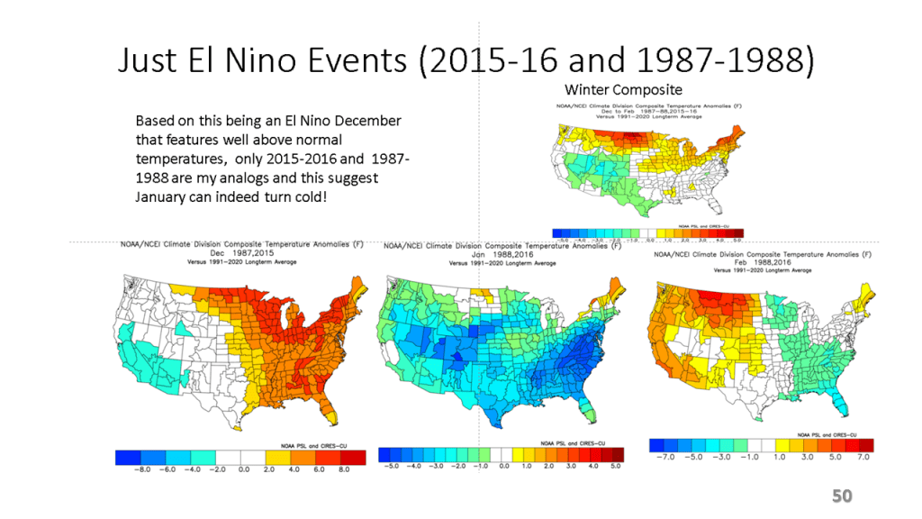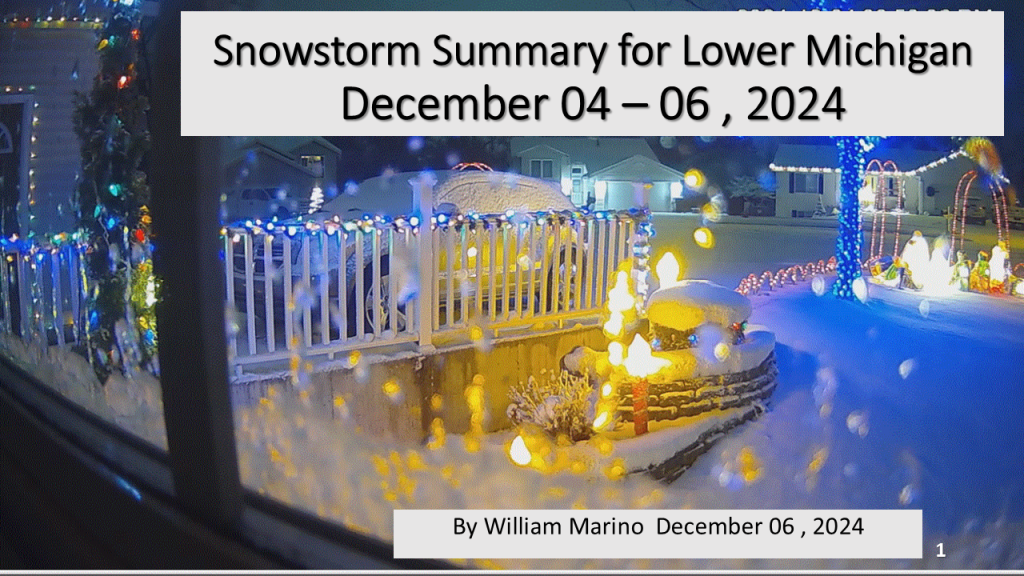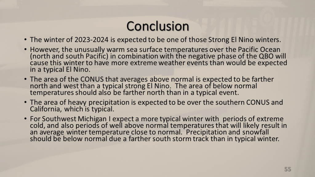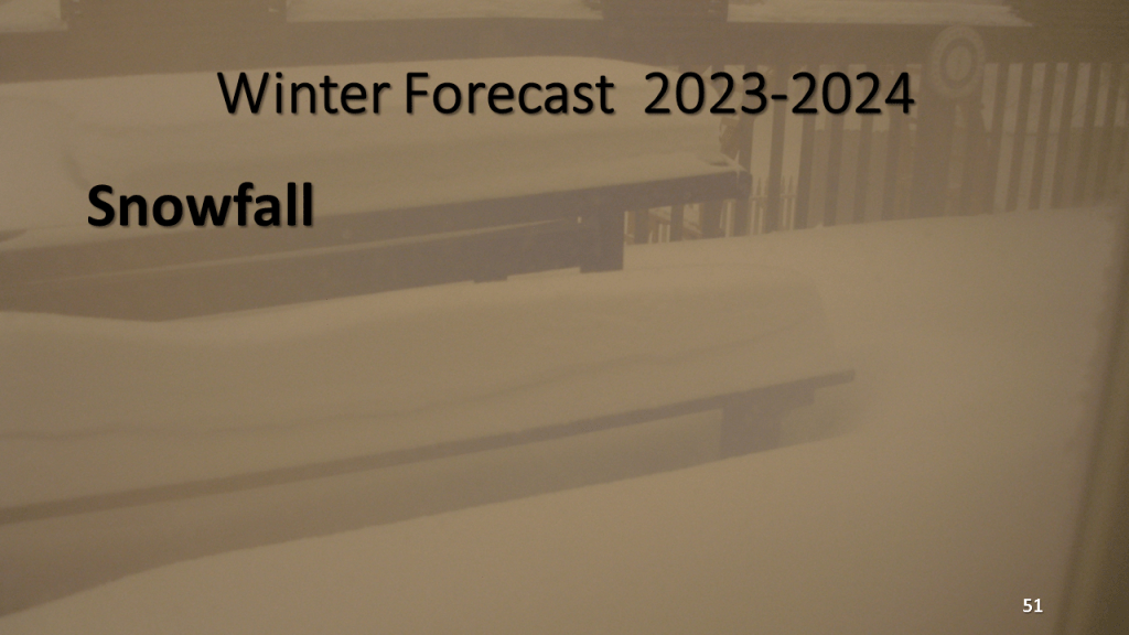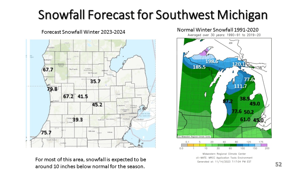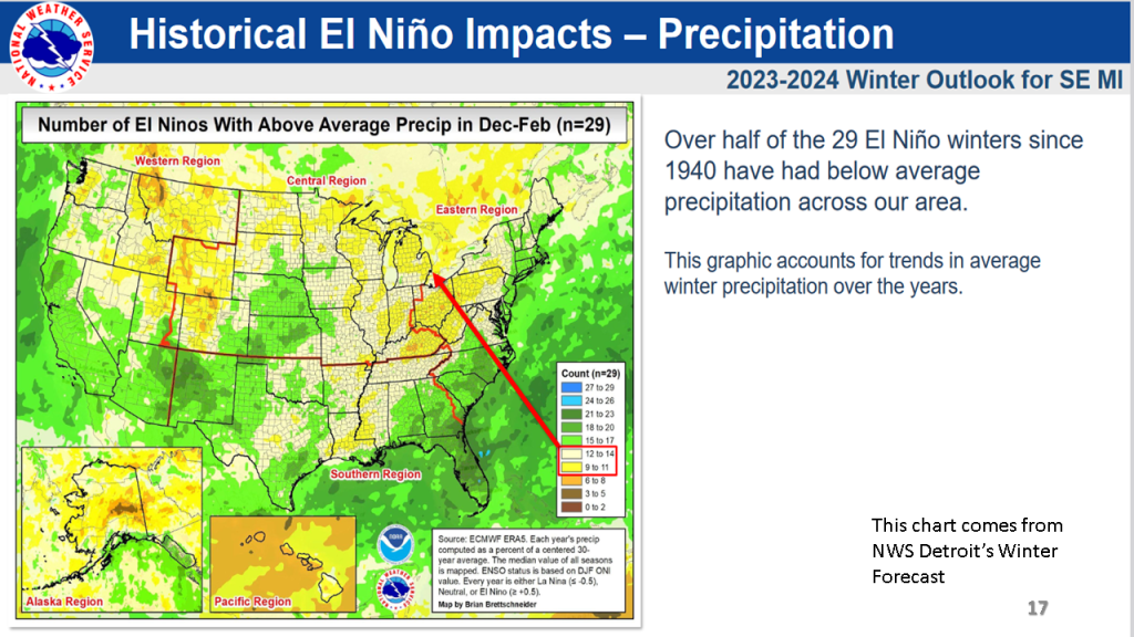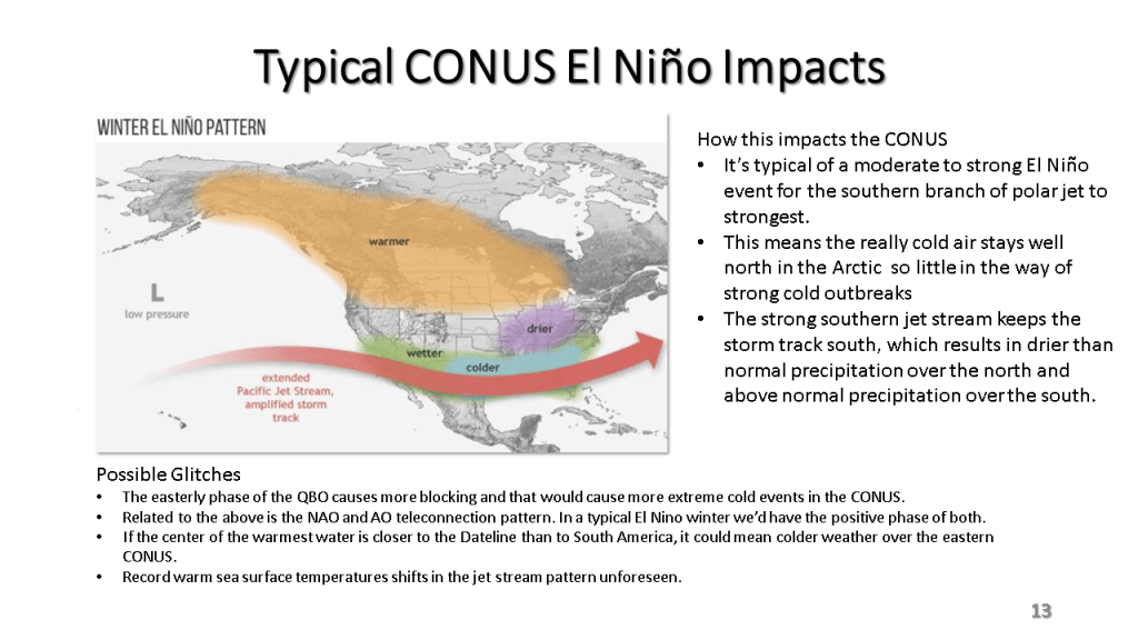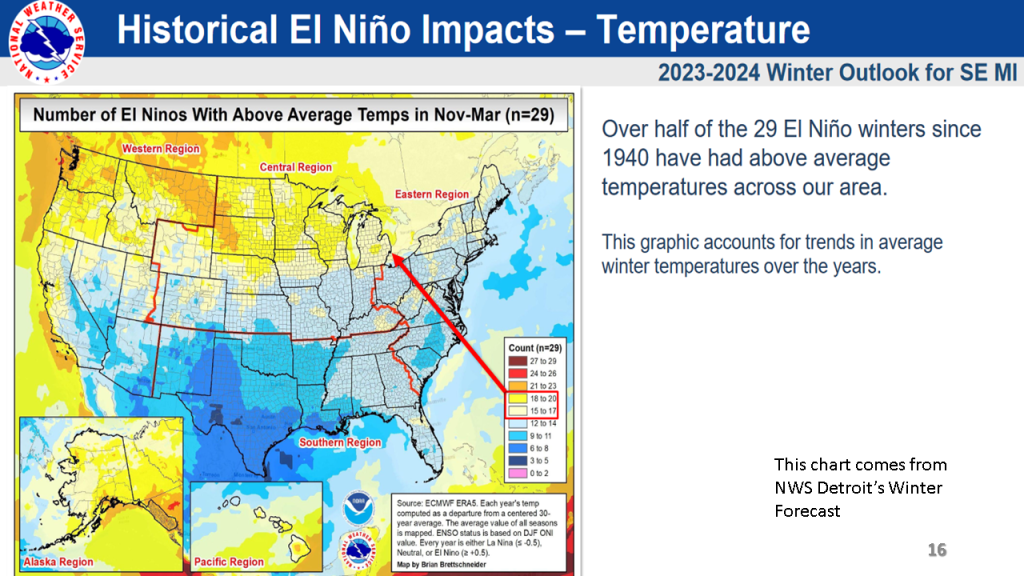 I am thinking snowfall will generally be below normal over Michigan, however sections of the East Coast, from North Carolina to Maine could have well above normal snowfall since El Nino’s favor Nor-Easters (Coastal Storms). When we get into a cooler pattern in January, I’d expect to see some heavy snow events along the east coast. See slide 48 for details.