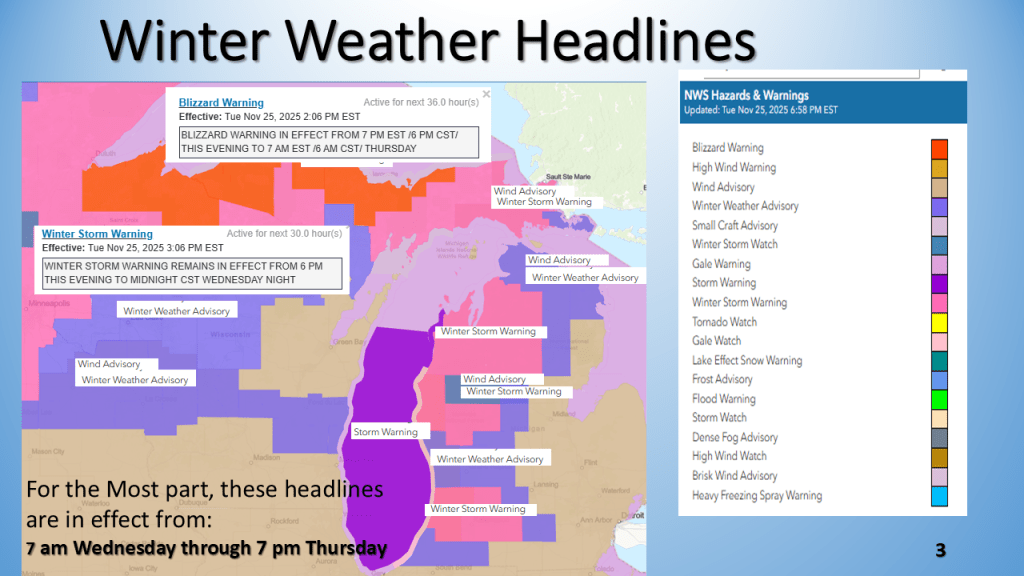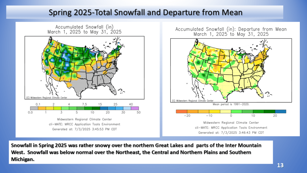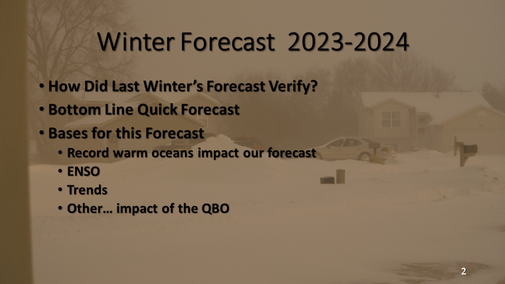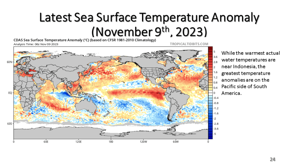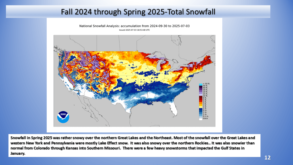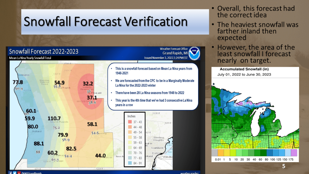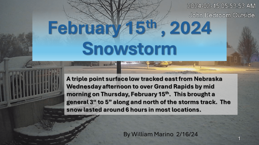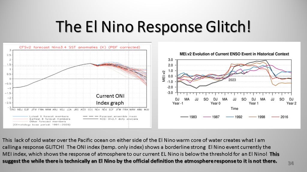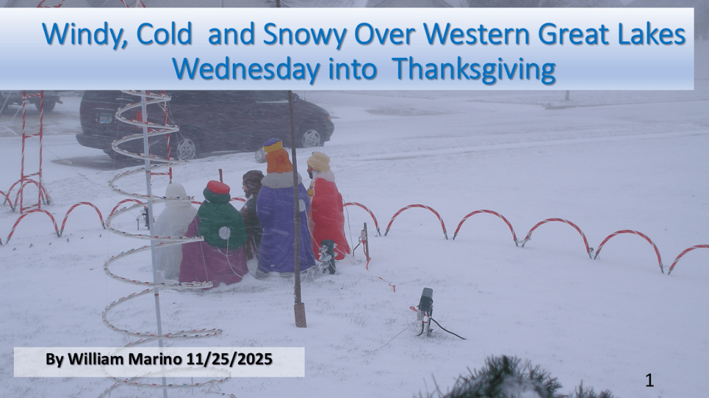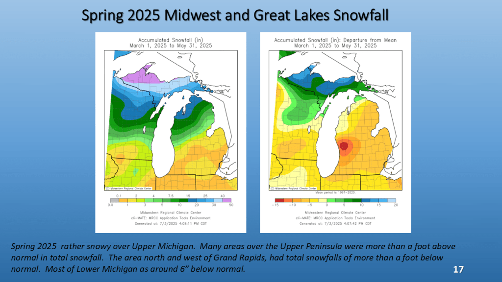 I am thinking snowfall will generally be below normal over Michigan, however sections of the East Coast, from North Carolina to Maine could have well above normal snowfall since El Nino’s favor Nor-Easters (Coastal Storms). When we get into a cooler pattern in January, I’d expect to see some heavy snow events along the east coast. See slide 48 for details.