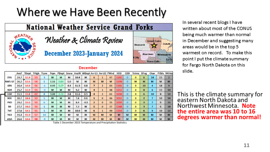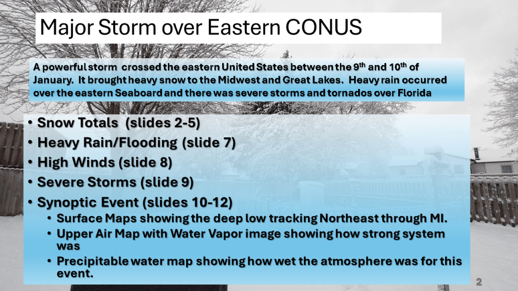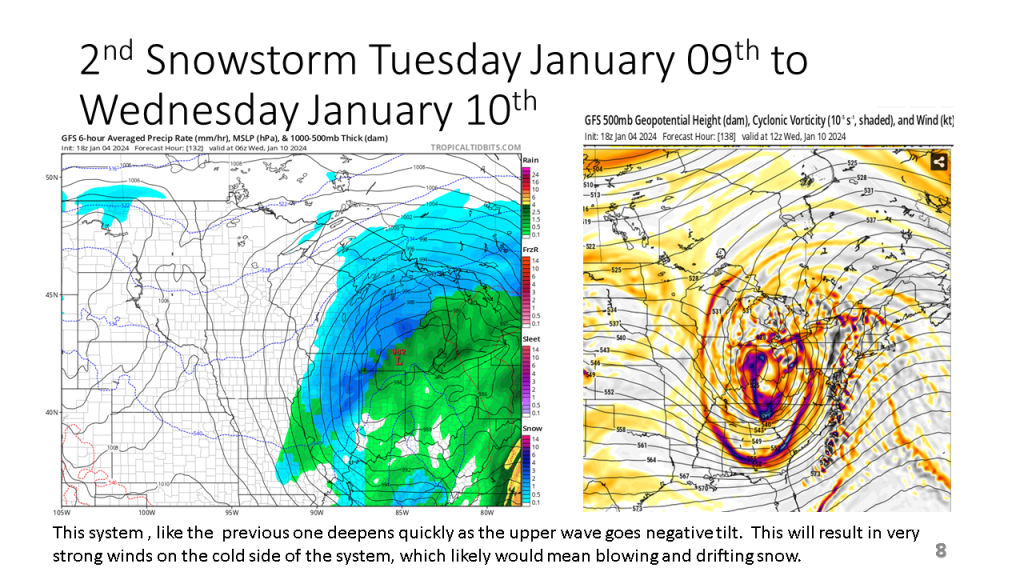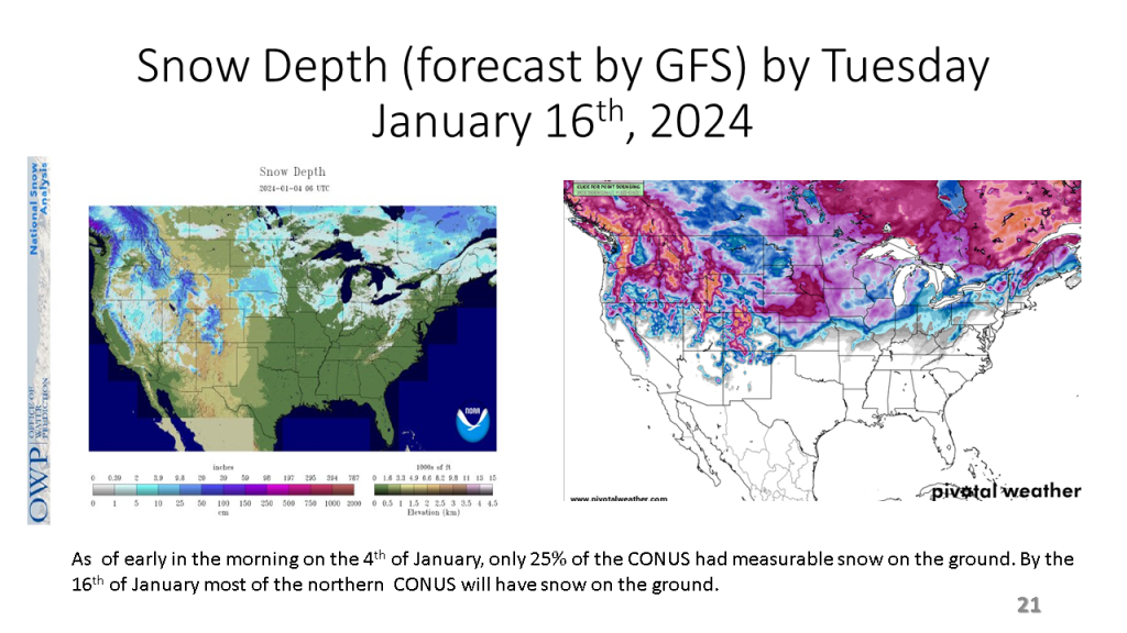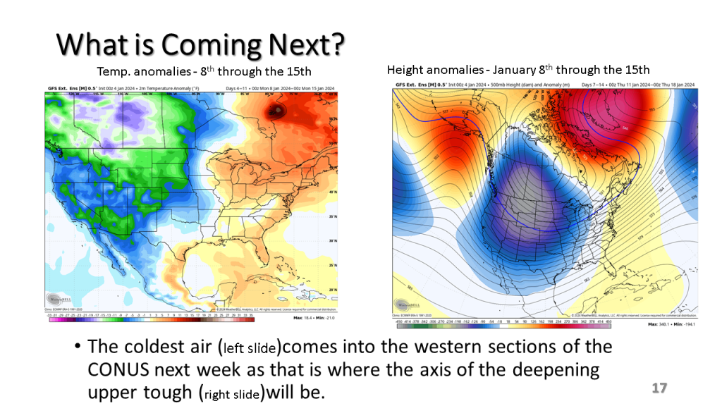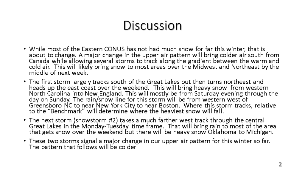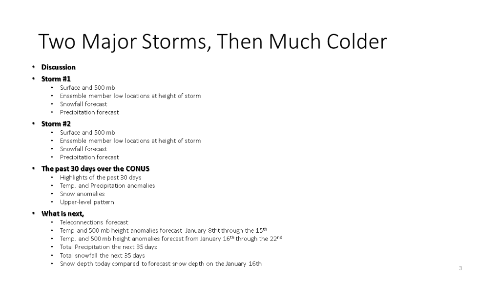 In Conclusion, the storms we will see over the central and eastern Untied States between now and Wednesday are the forerunners of a major change in the weather pattern over the CONUS. That past month or so was mostly warmer than normal over nearly all of the CONUS, with just the southeast sections near to below normal. From the second week through the third week in January we will see much colder weather from the west coast to the east coast and the wet pattern will expand into the central United States. Snow will likely be on the ground over most locations north of Indianapolis by the end of next week.