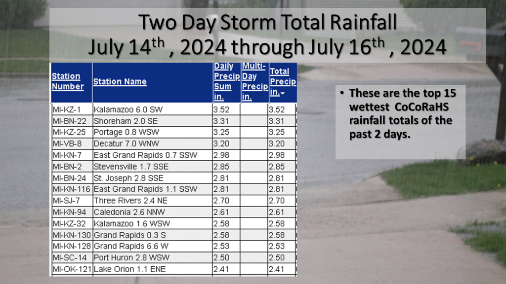 Kalamazoo’s CoCoRaHS report of 3.52″ was the greatest total from the reports I have seen.