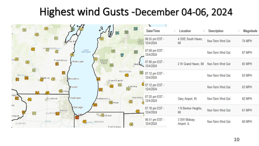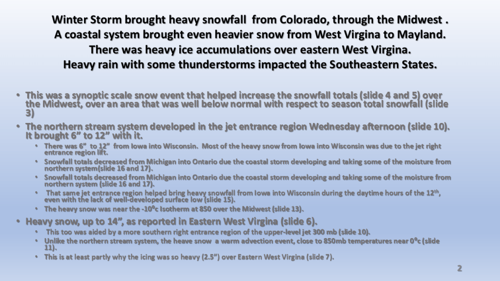 This storm brought heavy snow to the Midwest and parts of the Great Lakes, then there were damaging winds over the eastern Seaboard, as well as flooding. Severe storms and over a dozen tornadoes occurred over the Southeast sections.