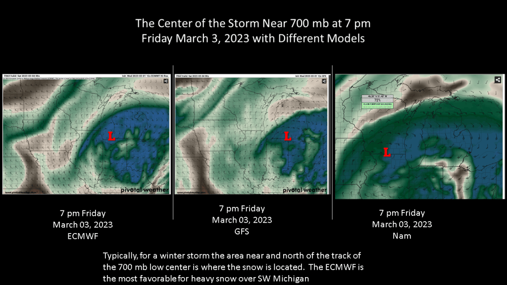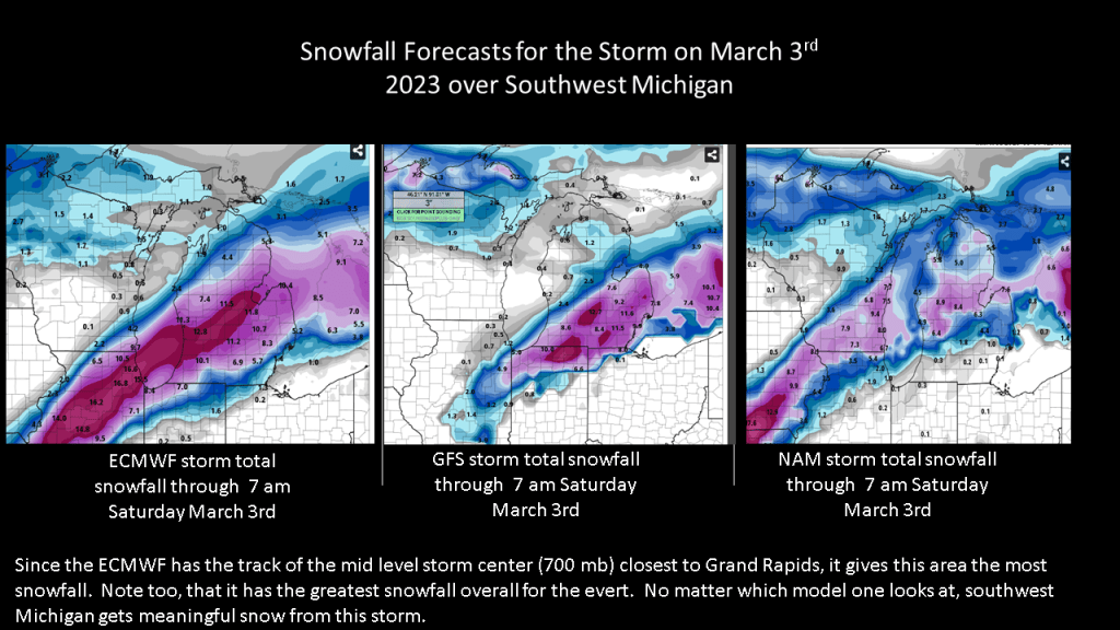 One other point about this, just about every run has an area with over a foot of snow. This storm has great upper level and mid level support plus Gulf Moisture to help it’s cause. So, there will be an area of heavy wet snow with this storm, but likely it will stay south of a line from Saginaw to Grand Rapids.