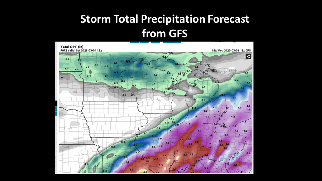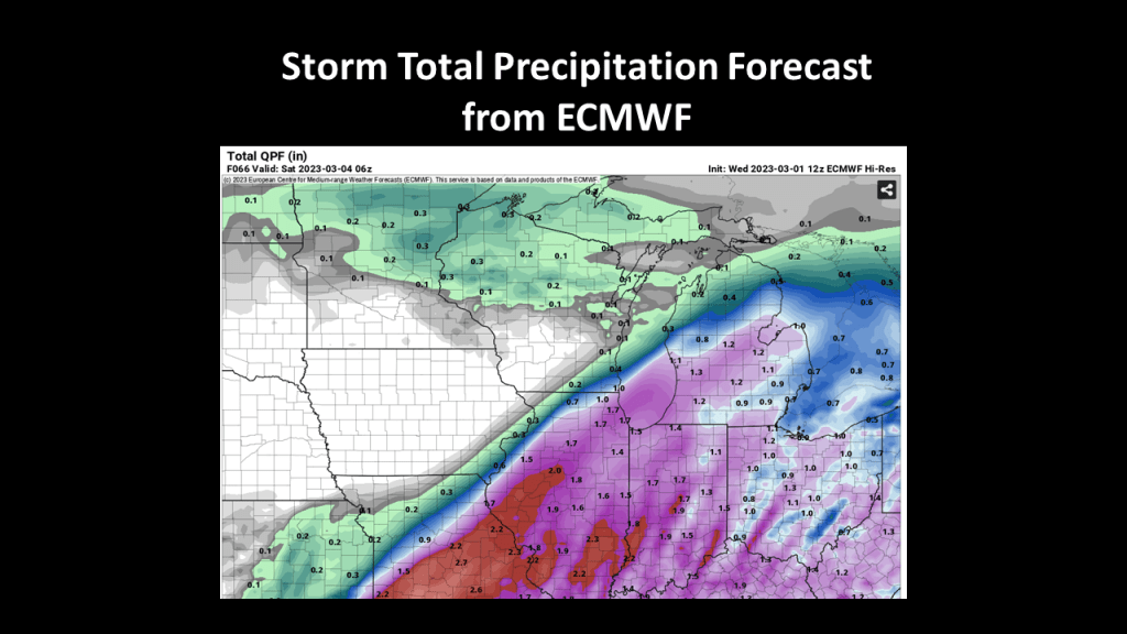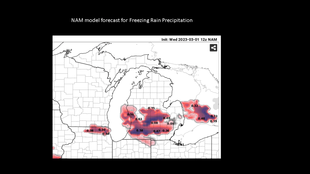 Last Wednesday, February 22, 2023 I suggest there would be three significant storm between the 23rd of February and the end of this this current week. As it turns out, 5 days later the story as not changed at all. Clearly we got the storm on the 23th. That was a major ice storm from Kalamazoo to Jackson and as far north as Lansing. Below are the precipitation totals for that storm, snowfall totals and the ice accumulations.